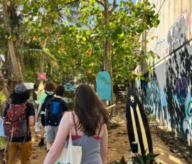 After lunch, we returned to the hotel to rest for a bit. Leisa made a run to the pharmacy, where she bought much-needed sunscreen, Febreeze, and Skittles. While some continued to sleep, some of us went to the plaza for the festival. At the festival we bought smoothies, and lemonade for the tinglar festival. We then met up with the rest of the group to go paddle boarding with Ramon in the reserve. We split up into to two groups, one group swam while the other went paddle boarding on a small river amid red and white mangrove trees, coconut palms, and coquis. The first paddle boarding group took two hours. They had deep conversations of politics, United Sates invasion of Puerto Rico, sugar cane railroads, and leather back turtle nest. The next was much faster, not as many questions. We got a run down on how they track the leather back turtles nest and talked a lot about mangroves. Some people had struggles on the boards: Jesus fell off, Eleanor hit many trees.