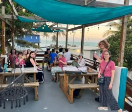 Once we got to the house we all settled in, all the boys are together. The rooms we are staying in are amazing, very nice showers, couches, and even TVs. We had more time to settle in and Mar gave us the deets about what was happening. T’za came out sizzling, Nahar, Xander, and Enrique volunteered to go with Mar on a quick walk to grab the slinged pies. It’s a cute little place near a church and we can see the beach from our communal hangout deck porch thing.