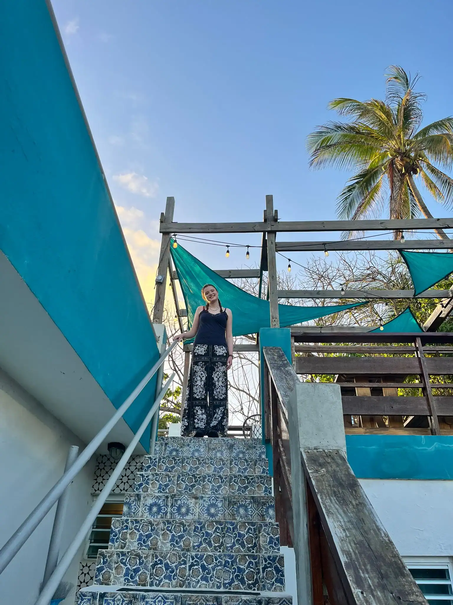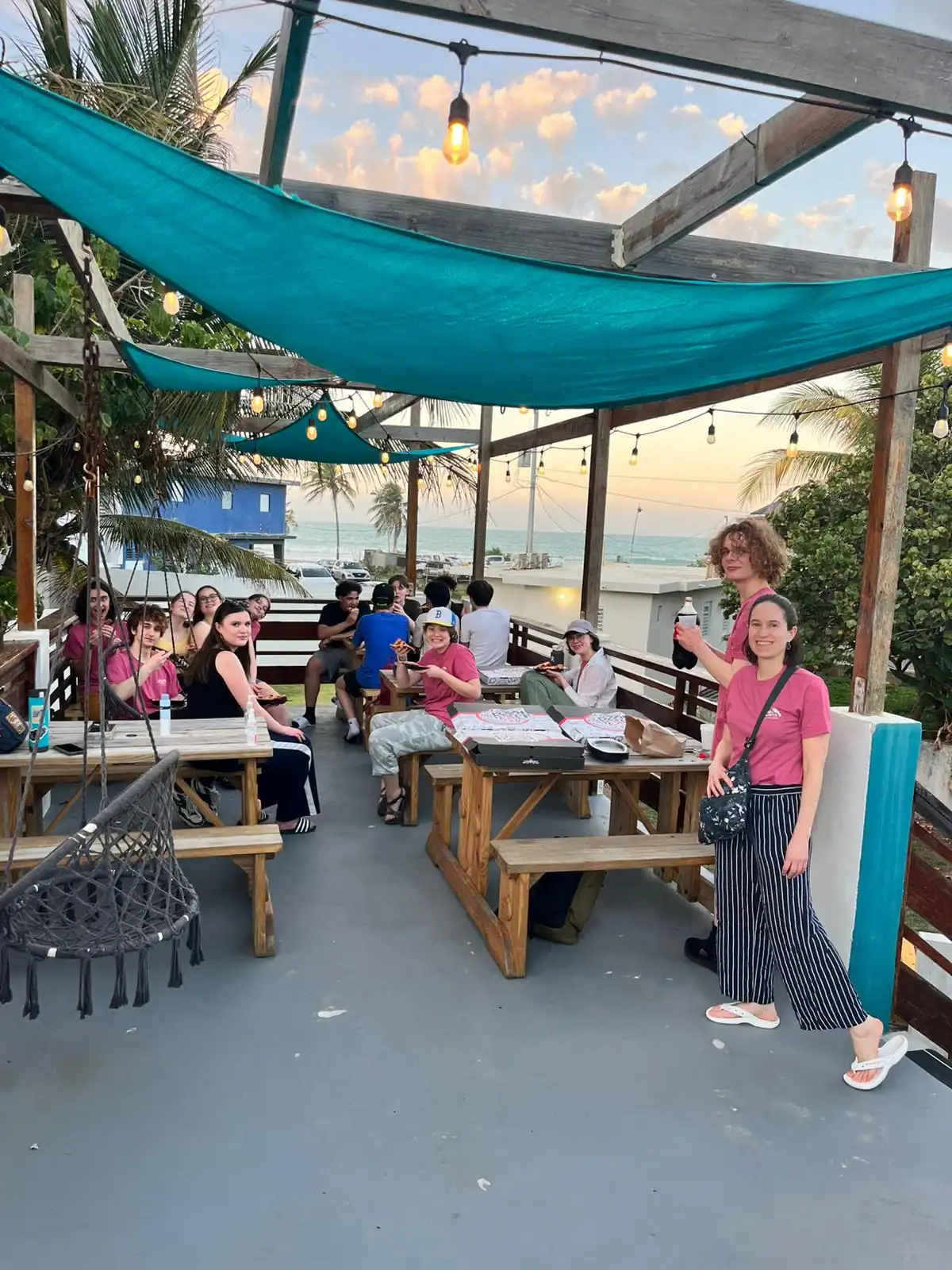 Once we got to the house we all settled in, all the boys are together. The rooms we are staying in are amazing, very nice showers, couches, and even TVs. We had more time to settle in and Mar gave us the deets about what was happening. T’za came out sizzling, Nahar, Xander, and Enrique volunteered to go with Mar on a quick walk to grab the slinged pies. It’s a cute little place near a church and we can see the beach from our communal hangout deck porch thing.