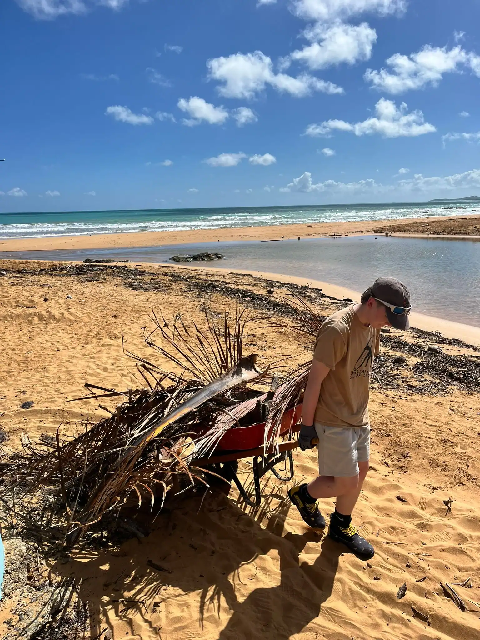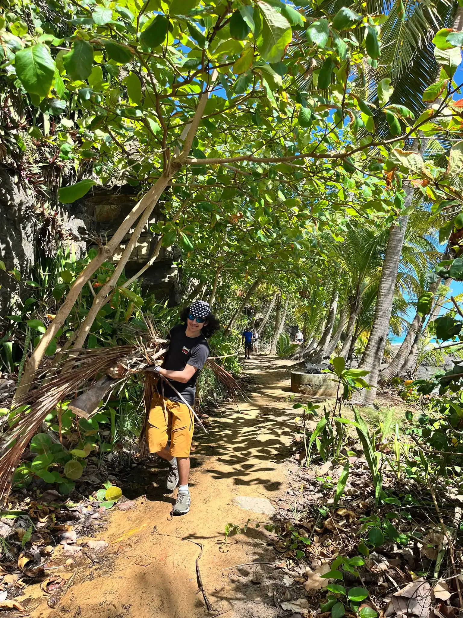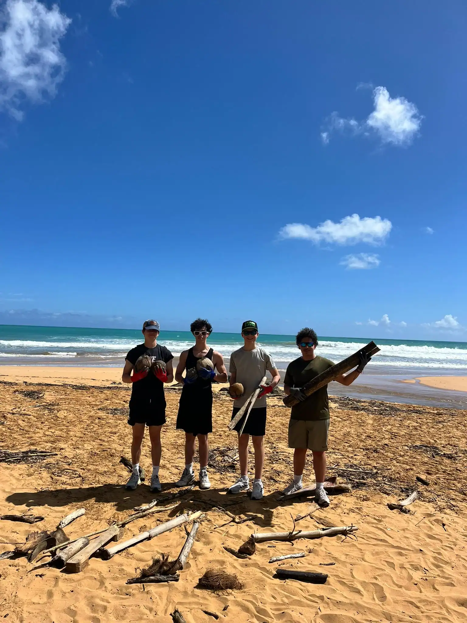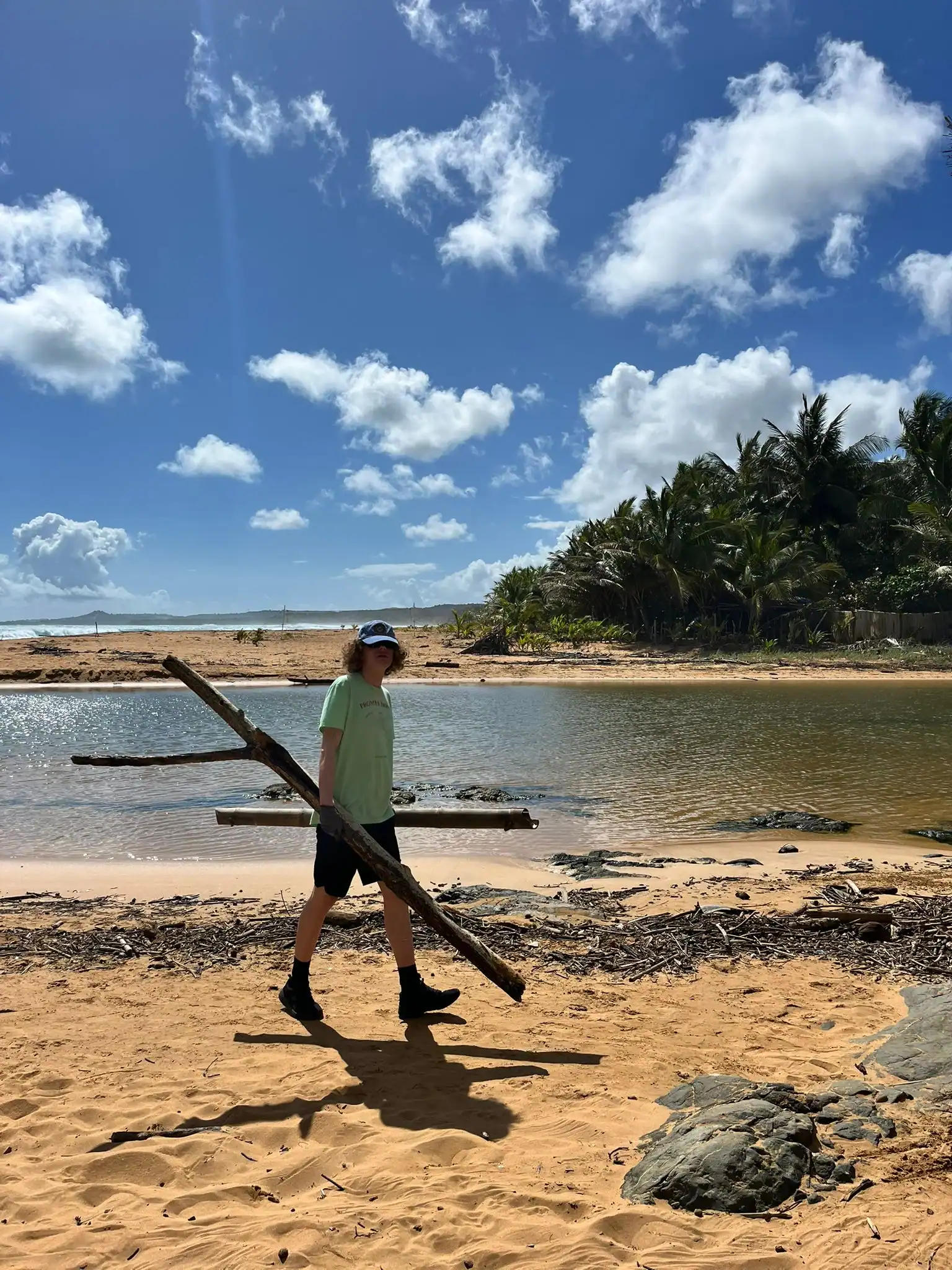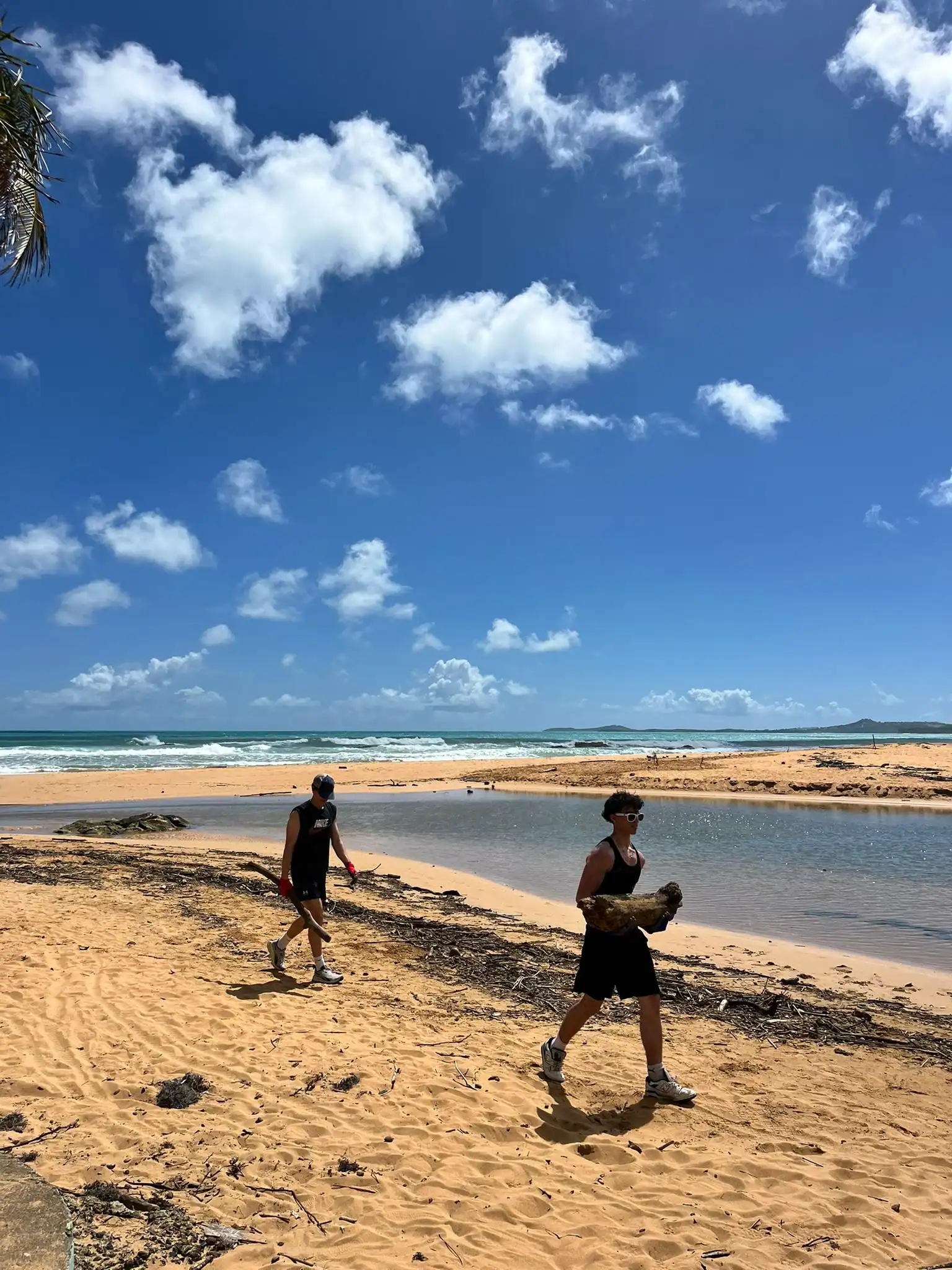 Then we walked over to the beach to meet up with Ramon. He talked us through his organzation and how Puerto Rico was invaded by the United States in 1898 and 90% of the island was dedicated to sugar cane production. He told us that the beach here in Luquillo is a significant nesting ground for leatherback turtles, or tinglares, as they’re known here. The large debris on the sand blocks their path, so we began cleaning objects on the beach like large branches coconuts and trash. Some people walked around with a trash bag and picked up trash. Others collected large bundles of branches and another group brought coconuts away in a wheelbarrow. Jack and Jesus broke open a coconut and drank some coconut water. Auden and Anna broke open a coconut and discovered some really big beetles. The mid-day got very hot, so wading in the cool river was perfect while we waited for our lunch of sandwiches and quesitos.