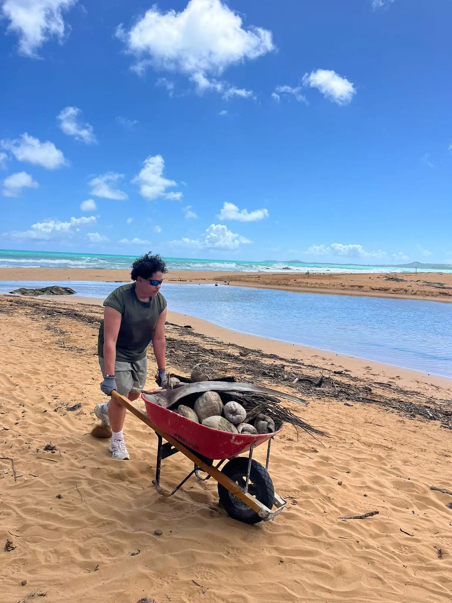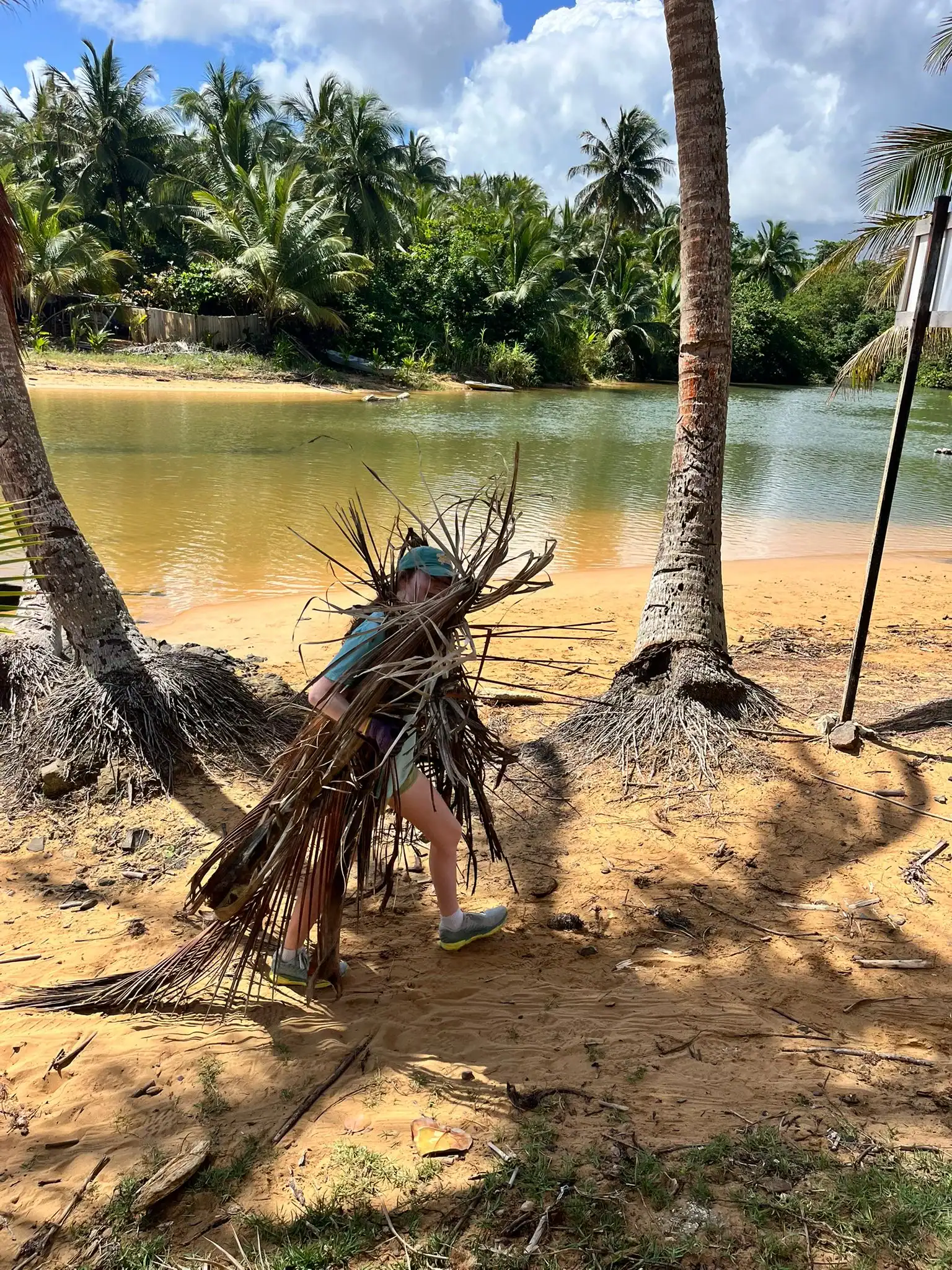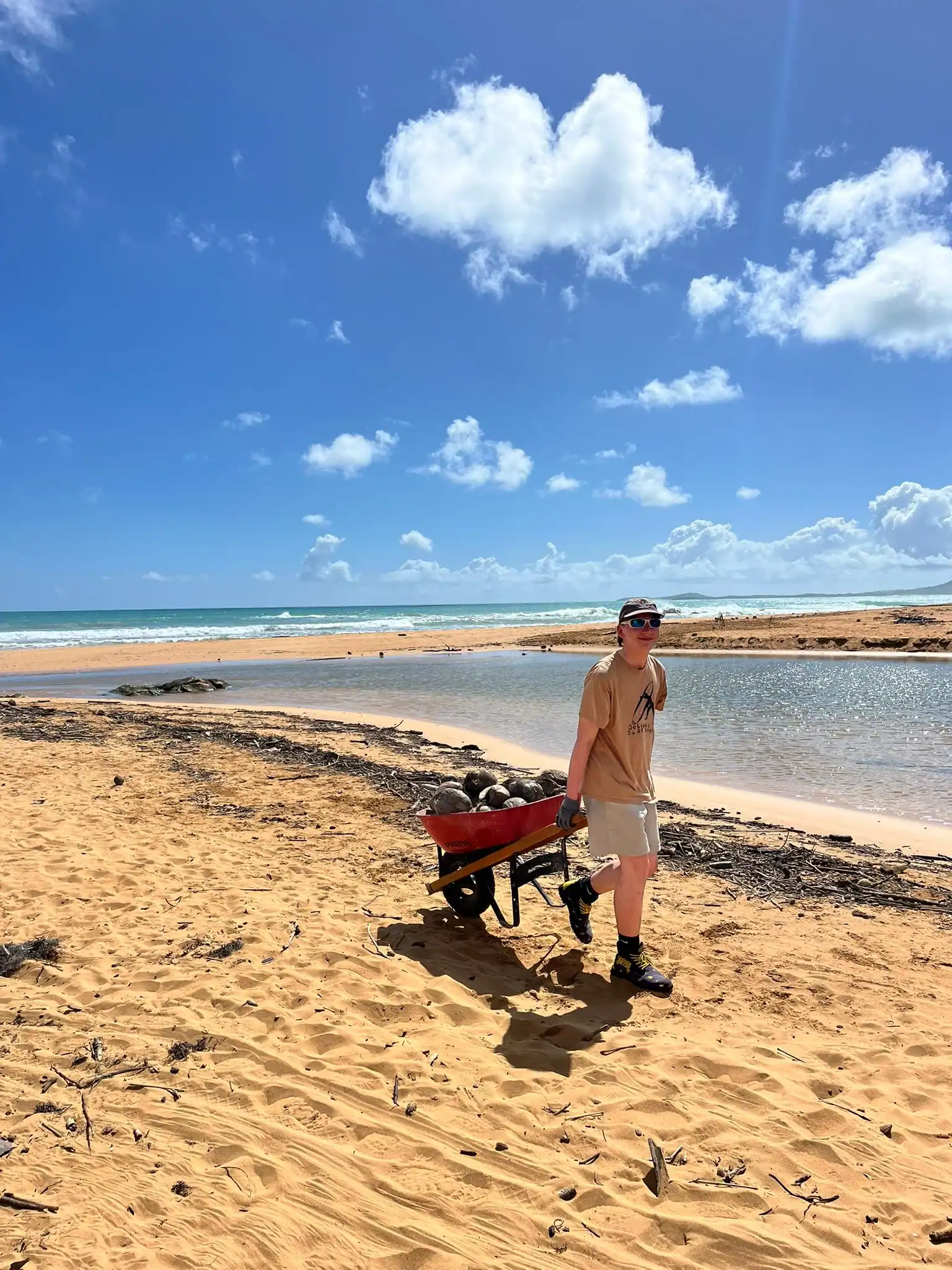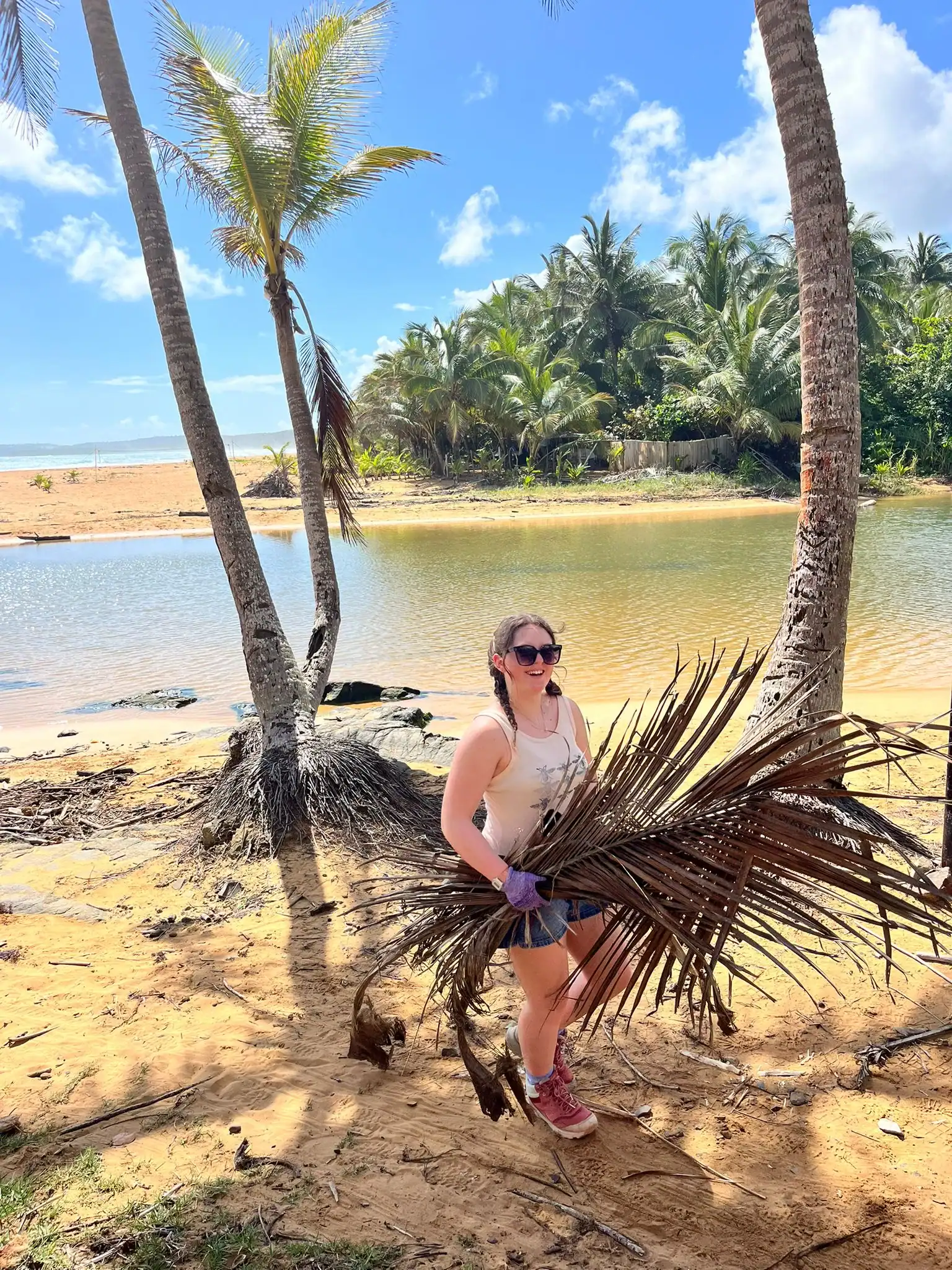 Then we walked over to the beach to meet up with Ramon. He talked us through his organzation and how Puerto Rico was invaded by the United States in 1898 and 90% of the island was dedicated to sugar cane production. He told us that the beach here in Luquillo is a significant nesting ground for leatherback turtles, or tinglares, as they’re known here. The large debris on the sand blocks their path, so we began cleaning objects on the beach like large branches coconuts and trash. Some people walked around with a trash bag and picked up trash. Others collected large bundles of branches and another group brought coconuts away in a wheelbarrow. Jack and Jesus broke open a coconut and drank some coconut water. Auden and Anna broke open a coconut and discovered some really big beetles. The mid-day got very hot, so wading in the cool river was perfect while we waited for our lunch of sandwiches and quesitos.