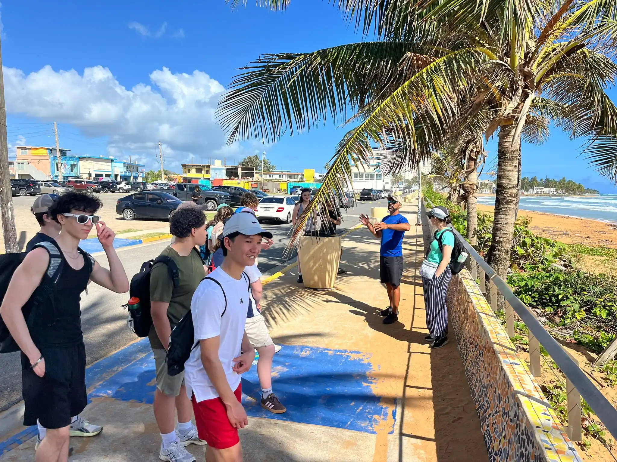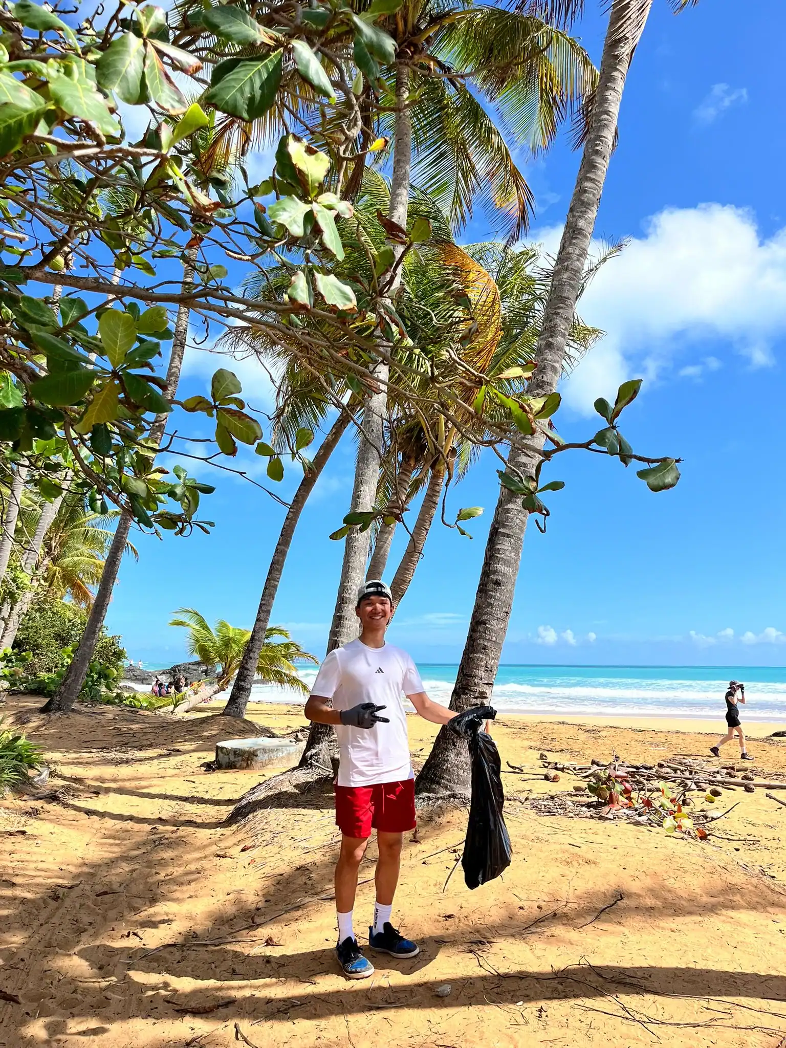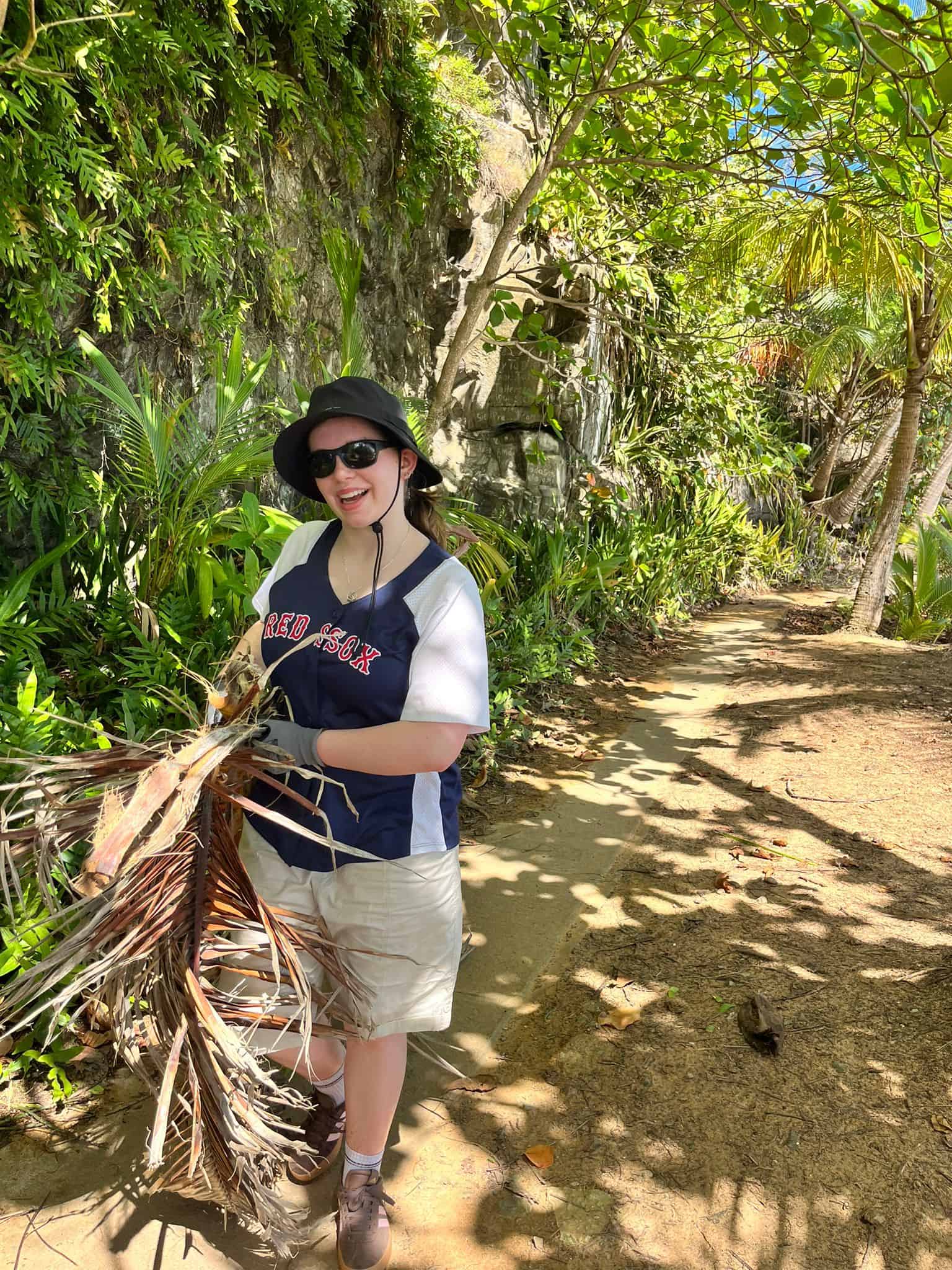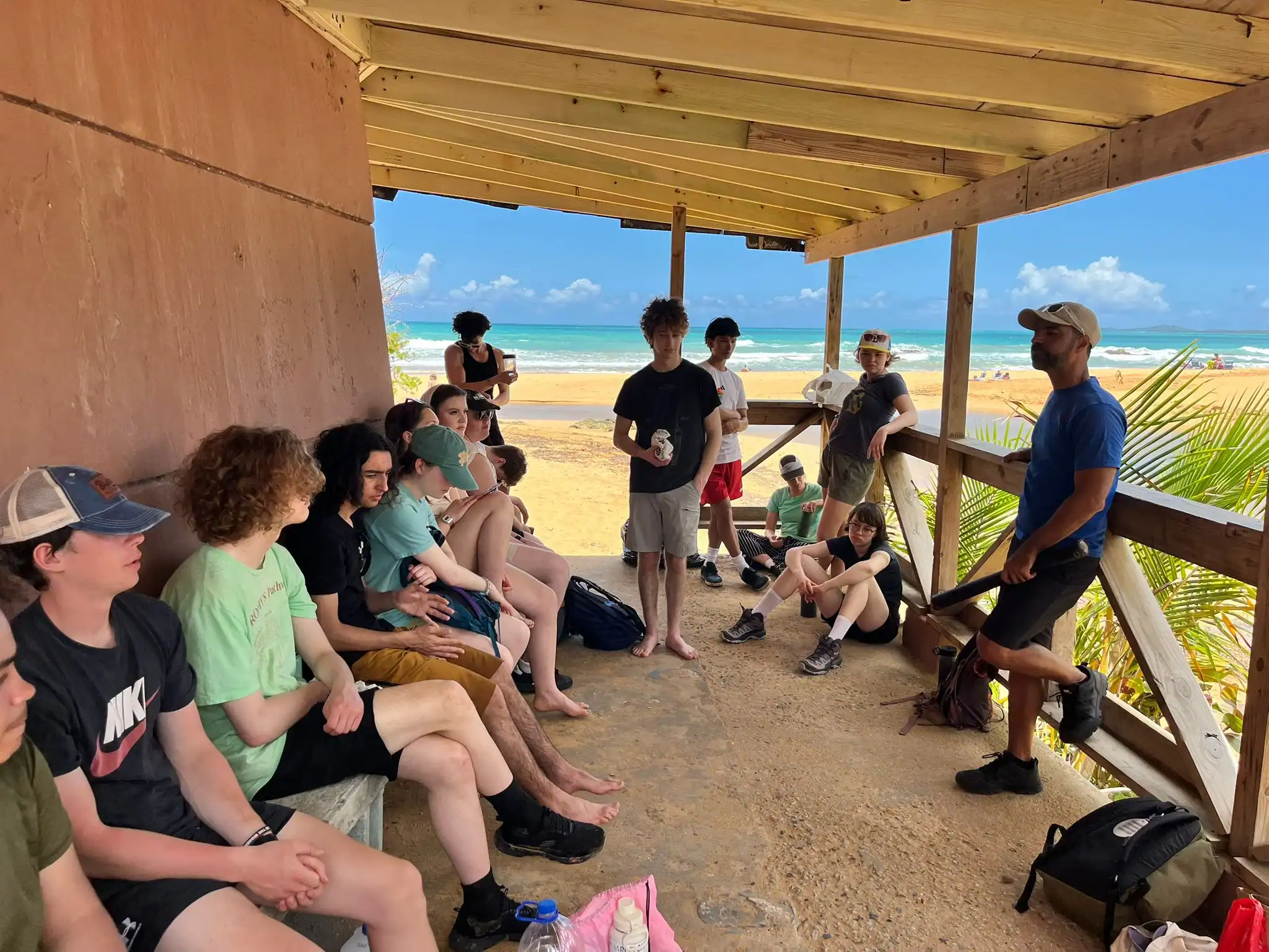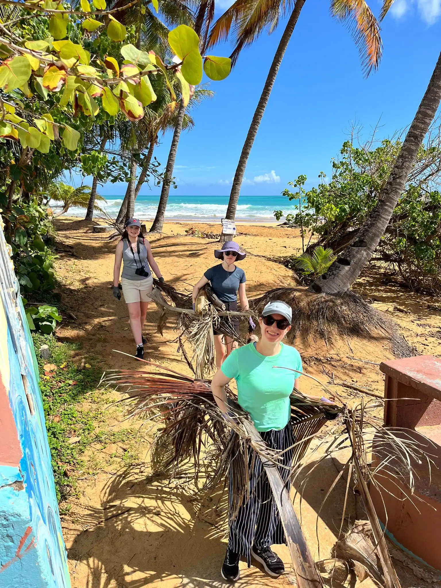 Then we walked over to the beach to meet up with Ramon. He talked us through his organzation and how Puerto Rico was invaded by the United States in 1898 and 90% of the island was dedicated to sugar cane production. He told us that the beach here in Luquillo is a significant nesting ground for leatherback turtles, or tinglares, as they’re known here. The large debris on the sand blocks their path, so we began cleaning objects on the beach like large branches coconuts and trash. Some people walked around with a trash bag and picked up trash. Others collected large bundles of branches and another group brought coconuts away in a wheelbarrow. Jack and Jesus broke open a coconut and drank some coconut water. Auden and Anna broke open a coconut and discovered some really big beetles. The mid-day got very hot, so wading in the cool river was perfect while we waited for our lunch of sandwiches and quesitos.
