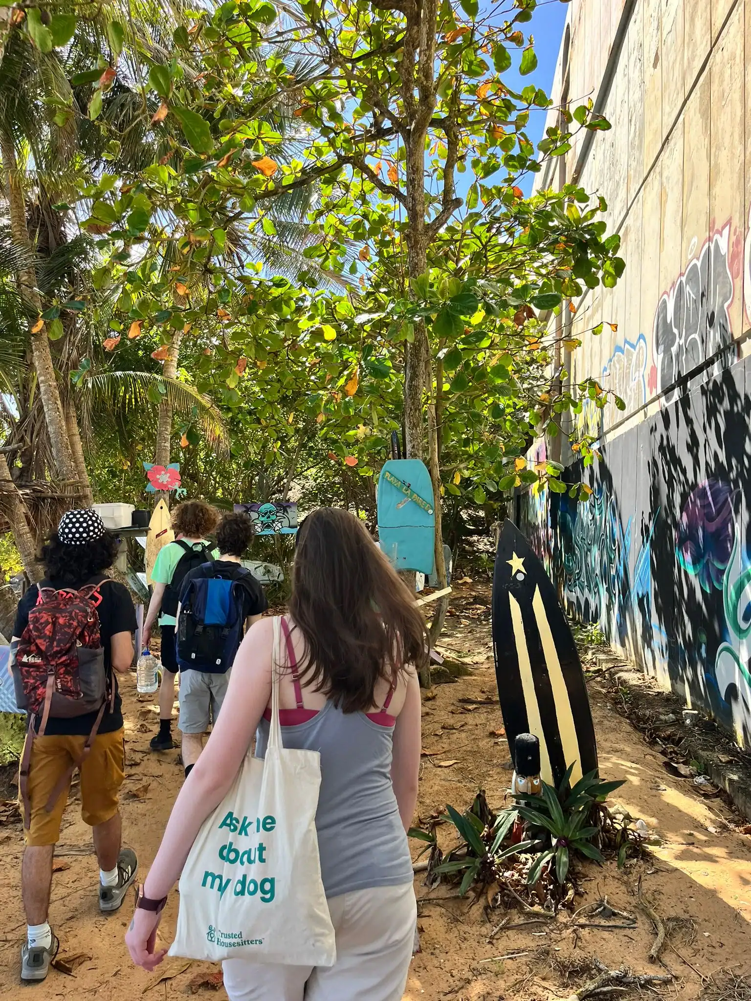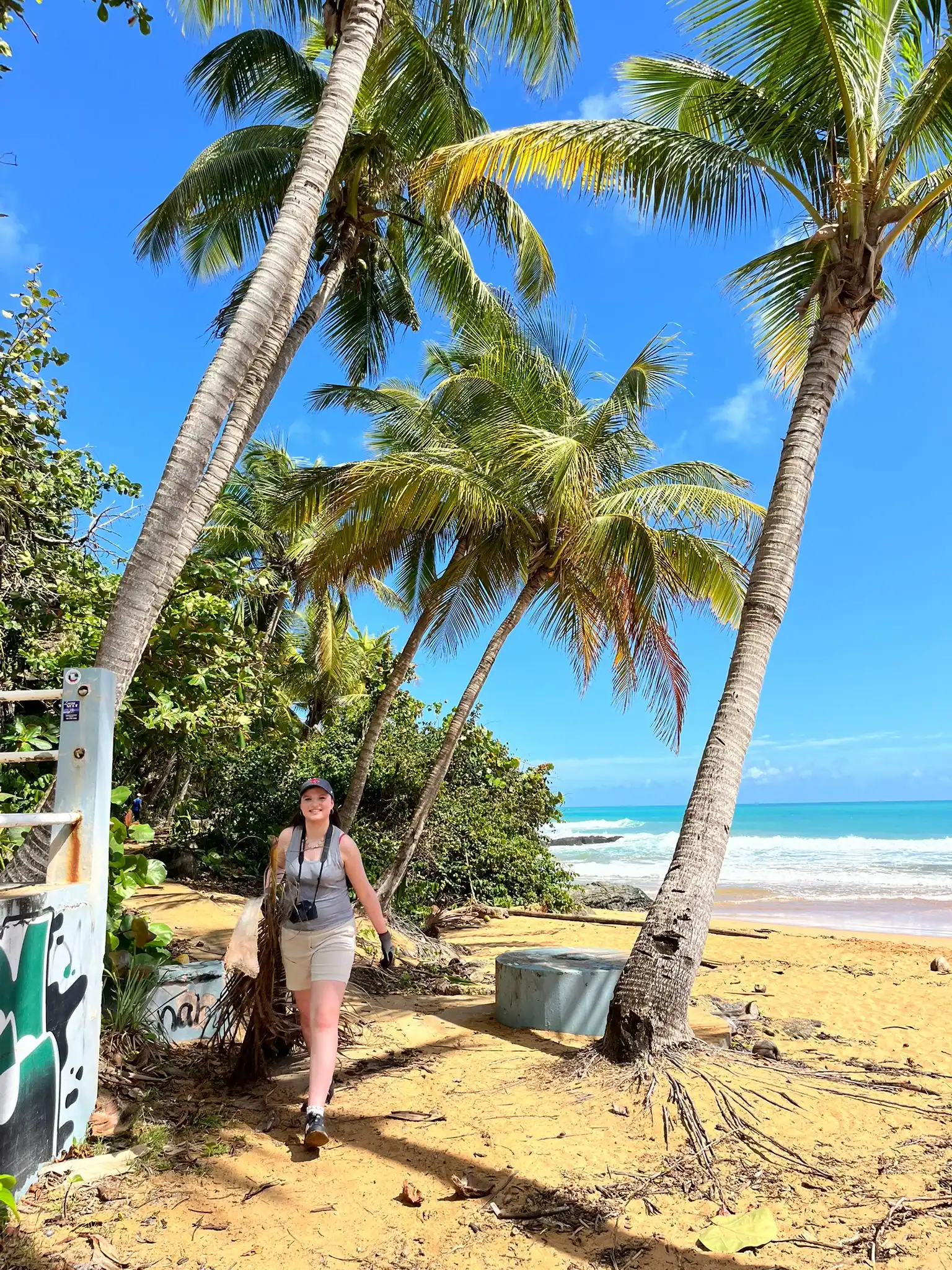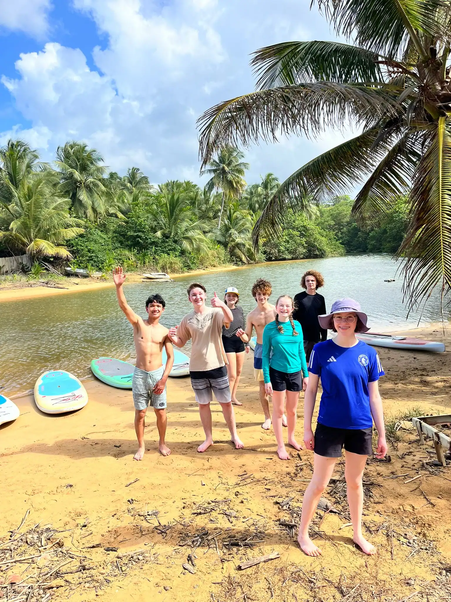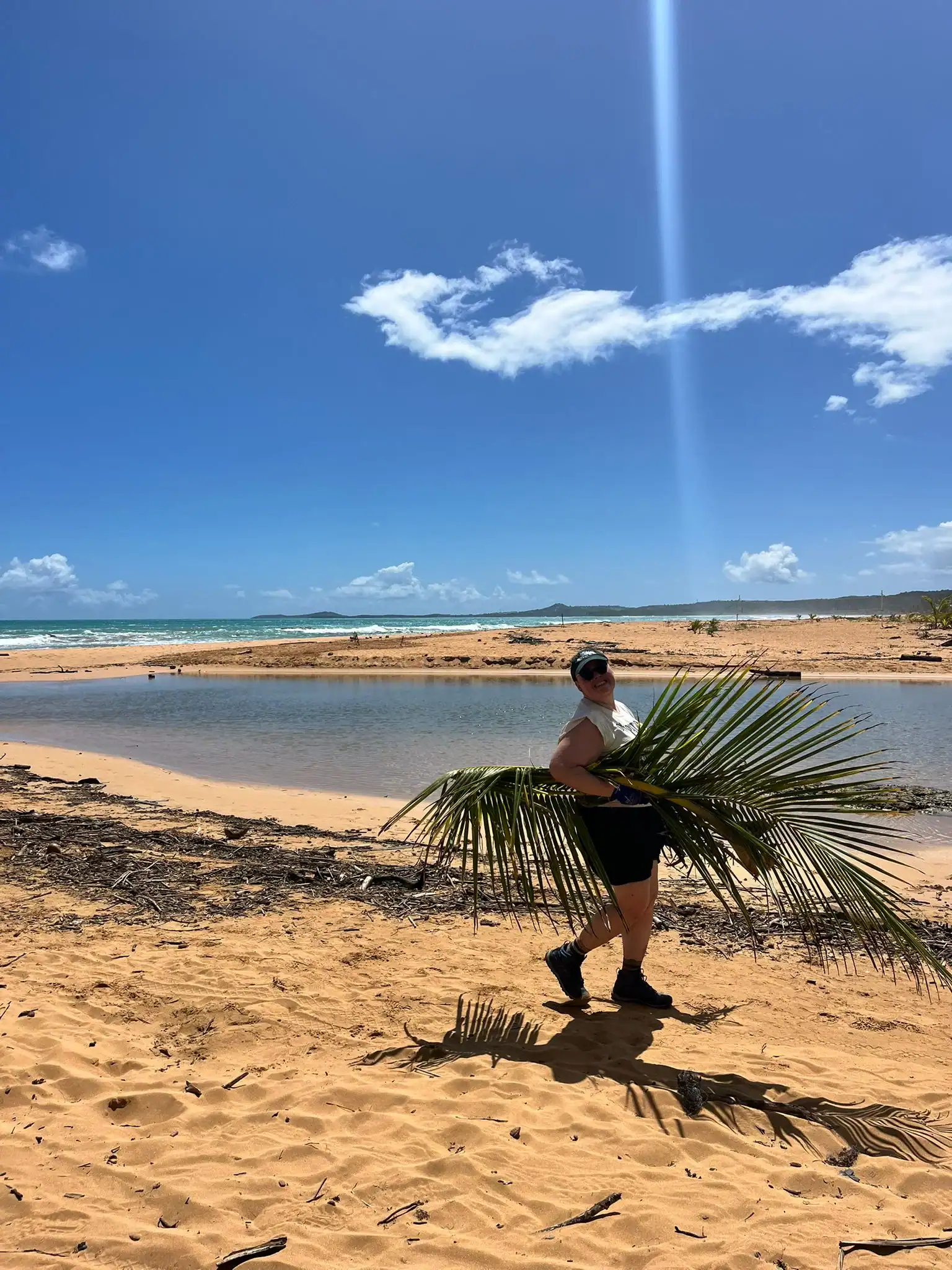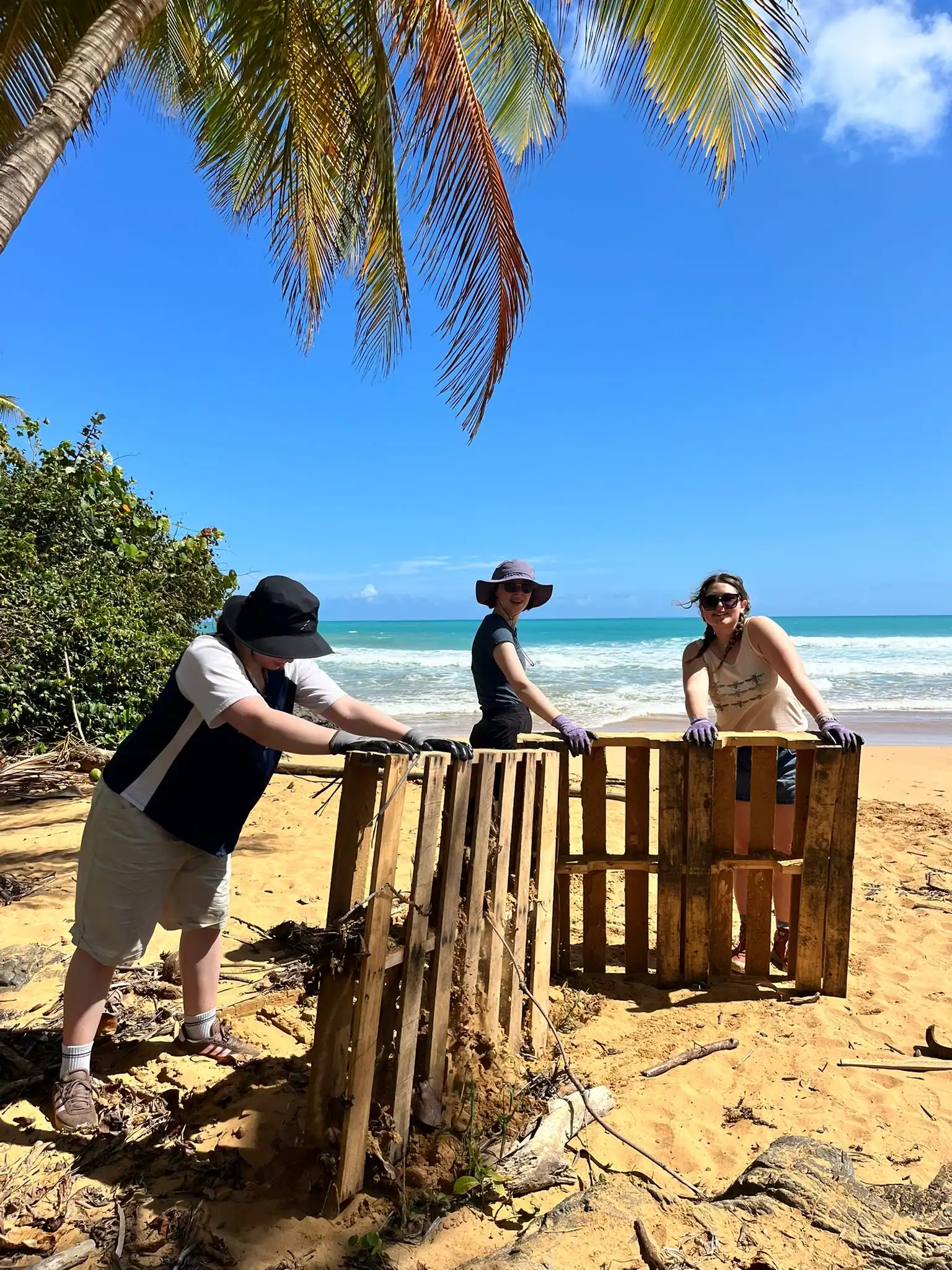 Then we walked over to the beach to meet up with Ramon. He talked us through his organzation and how Puerto Rico was invaded by the United States in 1898 and 90% of the island was dedicated to sugar cane production. He told us that the beach here in Luquillo is a significant nesting ground for leatherback turtles, or tinglares, as they’re known here. The large debris on the sand blocks their path, so we began cleaning objects on the beach like large branches coconuts and trash. Some people walked around with a trash bag and picked up trash. Others collected large bundles of branches and another group brought coconuts away in a wheelbarrow. Jack and Jesus broke open a coconut and drank some coconut water. Auden and Anna broke open a coconut and discovered some really big beetles. The mid-day got very hot, so wading in the cool river was perfect while we waited for our lunch of sandwiches and quesitos.