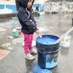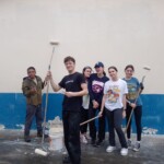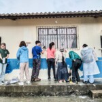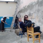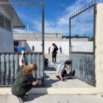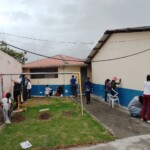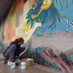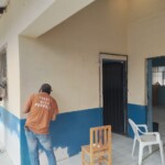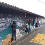 After an hour and a half of sanding, scraping, and dusting, we took a snack/rest/sunblock break. We had a potluck of snacks, shared with the kiddos at the school and were joined by a never-ending stream of dogs looking for some love and attention. It began to rain lightly during our break, so we huddled under the awnings until it was time to get back to work. We broke into two groups, artists repainting parts of a mural, while the beige wall painters got speckled, splashed, and startled by the amount of beige paint on our clothes, faces, and hair.