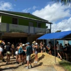 Buenos días from Puerto Rico! This morning we woke up at 7:15 to enjoy breakfast at 8:00. Our breakfast consisted of buttery pancakes, ham, fruit and the classic scrambled eggs. After breakfast, we joined Jorge in a stretching circle to prepare for our long, and final, day of work on the house. We got on the bus and after a quick twenty minute ride to the worksite, we got to work almost immediately. Although we were tired from our previous rainforest work, we persevered through the heat and were able to finish all of the walls for the house. We accomplished this through assembly lines and quick shoveling. We were able to enjoy the afternoon work with full stomachs from community member Maria’s flavorful rice with beans, comforting chicken nuggets, and refreshing salad. We were all excited to hear Angel call “¡Terminamos por hoy!” meaning “We were finished for the day!” after our last wall of cement was poured. Lots of naps on the ride home were quickly followed by beach football games. Don’t worry, we made the house look very clean for our dinner guests- Angel, William, Eggy, Maria, Beba, Talia, and their grandkids. We ate a familiar meal of hamburgers with cheese, onions, lettuce, tomatoes and lots of condiments. After this delicious meal, we spent some quality time with the community members playing volleyball, meeting their dogs, and playing games. Angel, William and Beba led a speech, translated by our leader, Lauren, letting us know about the important impact we have on the Puerto Rican community. They explained to us about the numerous groups that spent parts of their Spring and Summer on this project and the record breaking cement work that we accomplished. We learned the value of Global Works and how their dedicated workers put so much effort into changing over 60 families’ lives in Puerto Rico. After ópening the floor for questions from us, we were handed lovely gifts, bracelets with various charms on them. Of course, these bracelets came in the Puerto Rican colors of red, white, and blue. After taking a group picture in front of the Big Yellow House and saying our farewells to the community members, we celebrated our hard work with cupcakes. To end the final night in the BYH, we will continue to play games and pack for the long day ahead of us tomorrow.