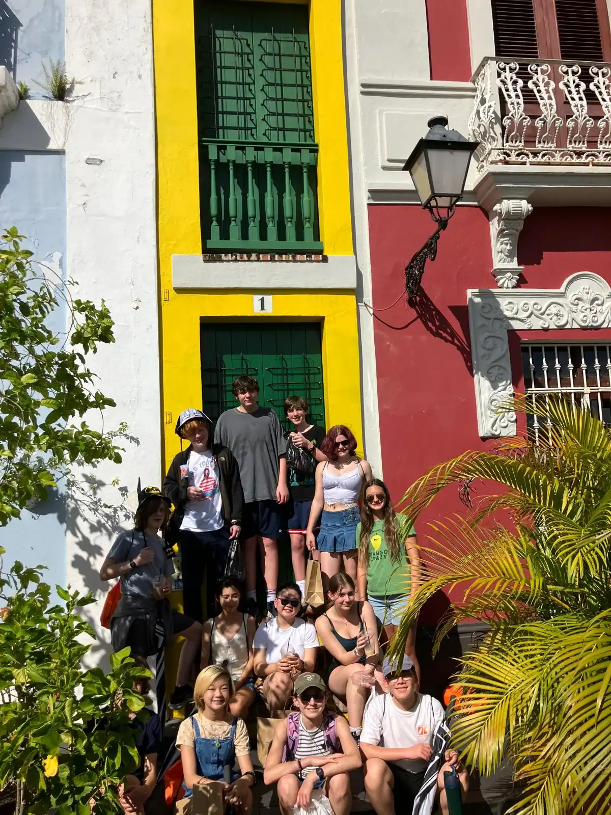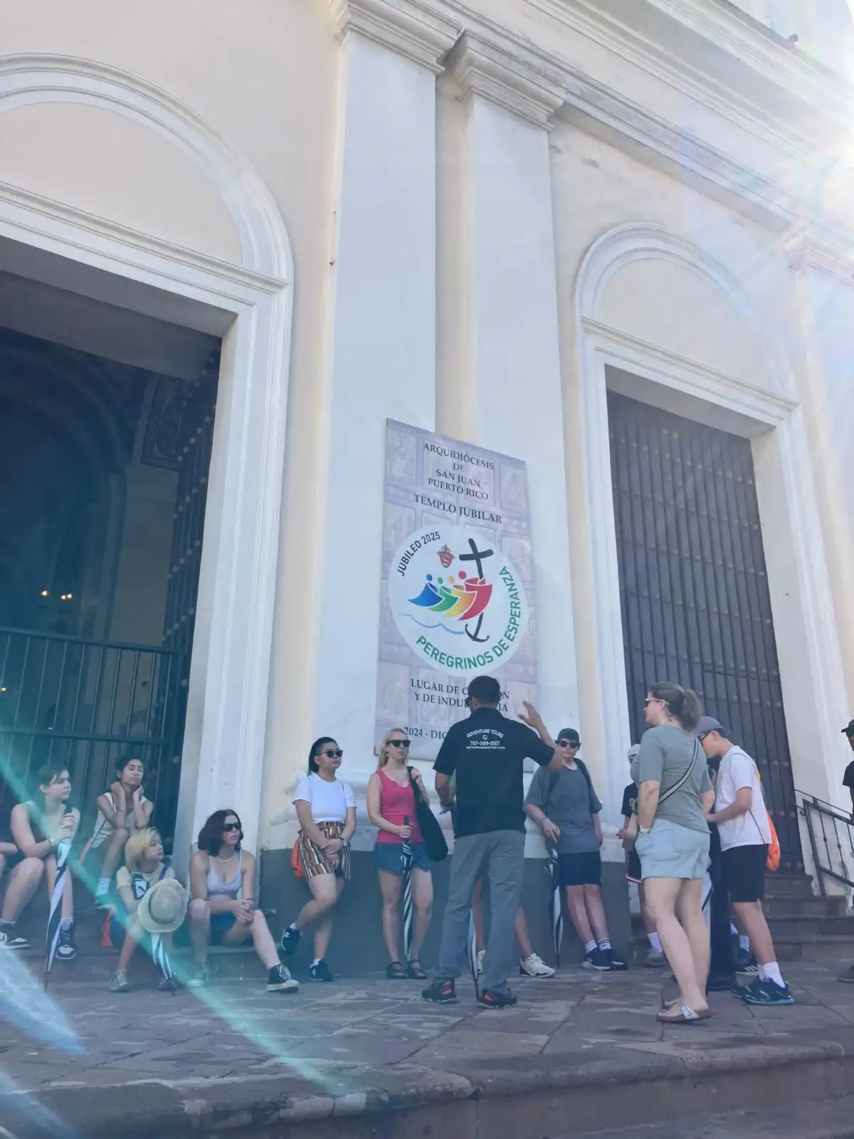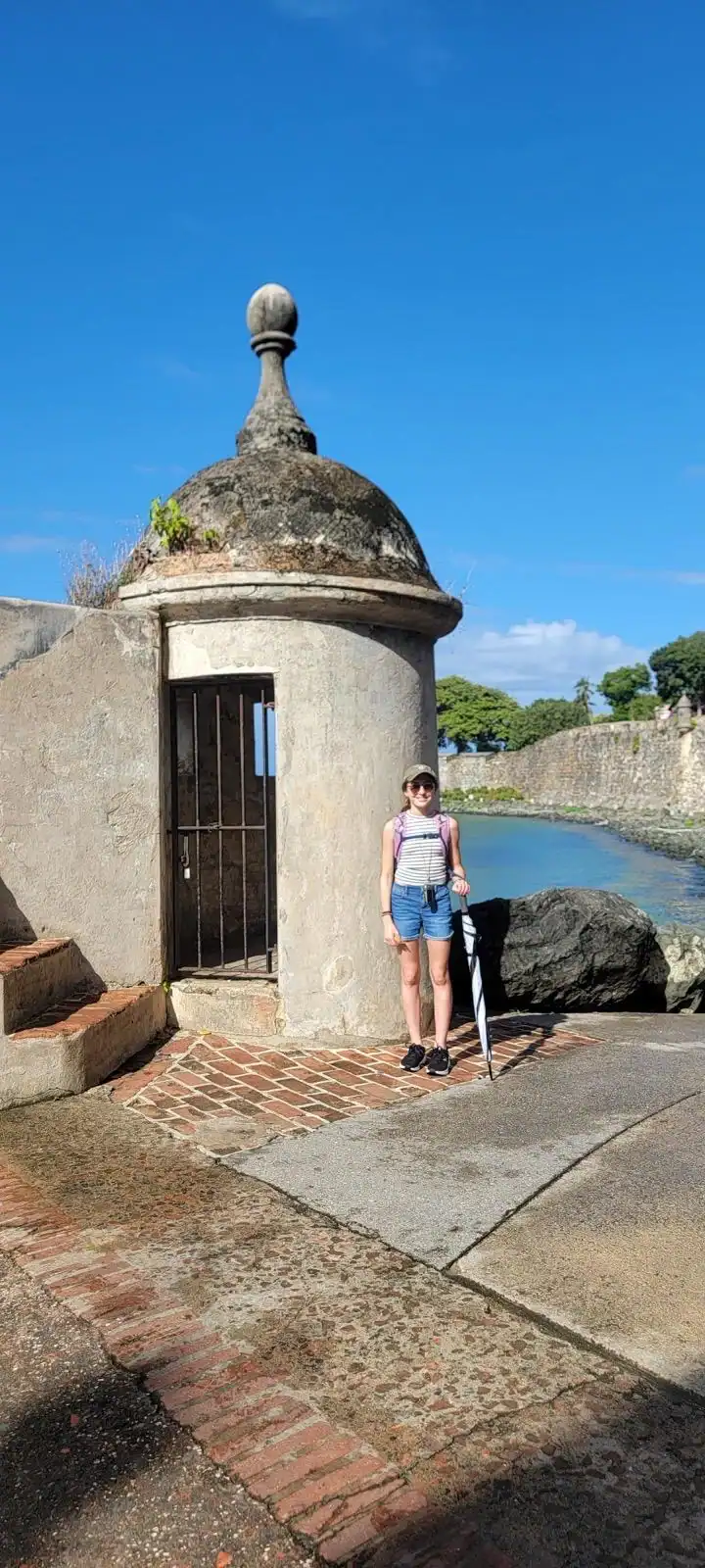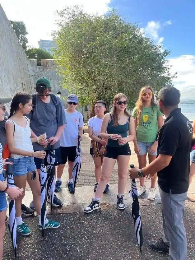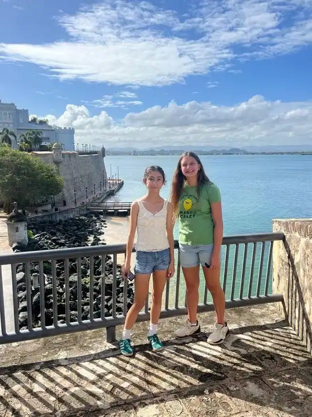 Today was a great start to our Puerto Rico trip! We began the day with a delicious breakfast and then set out to explore Old San Juan. We walked along the blue cobblestone streets and observed historic monuments such as churches, statues and fortresses. El Morro was one of the fortresses that we visited, and it had a gorgeous view of the ocean, many tunnels and staircases, and great spots for photos. Next, we walked among the colorful buildings of Old San Juan to get to our lunch restaurant. We ate tasty Puerto Rican cuisine before exploring the local shops to buy souvenirs. Some of the souvenirs that we bought included sweatshirts, jewelry, bucket hats with ears that move, t-shirts, and some local instruments. We also stopped at one of the narrowest houses in the world, which is only five feet across the entire way back!