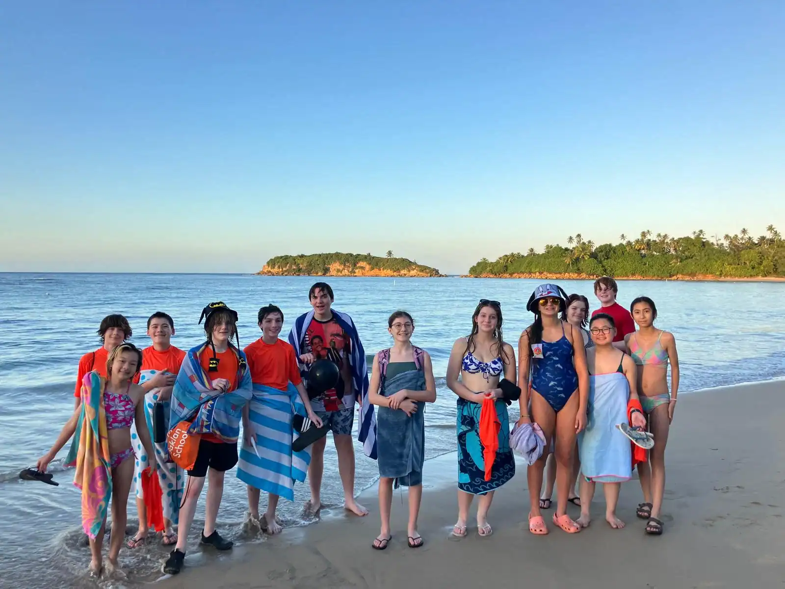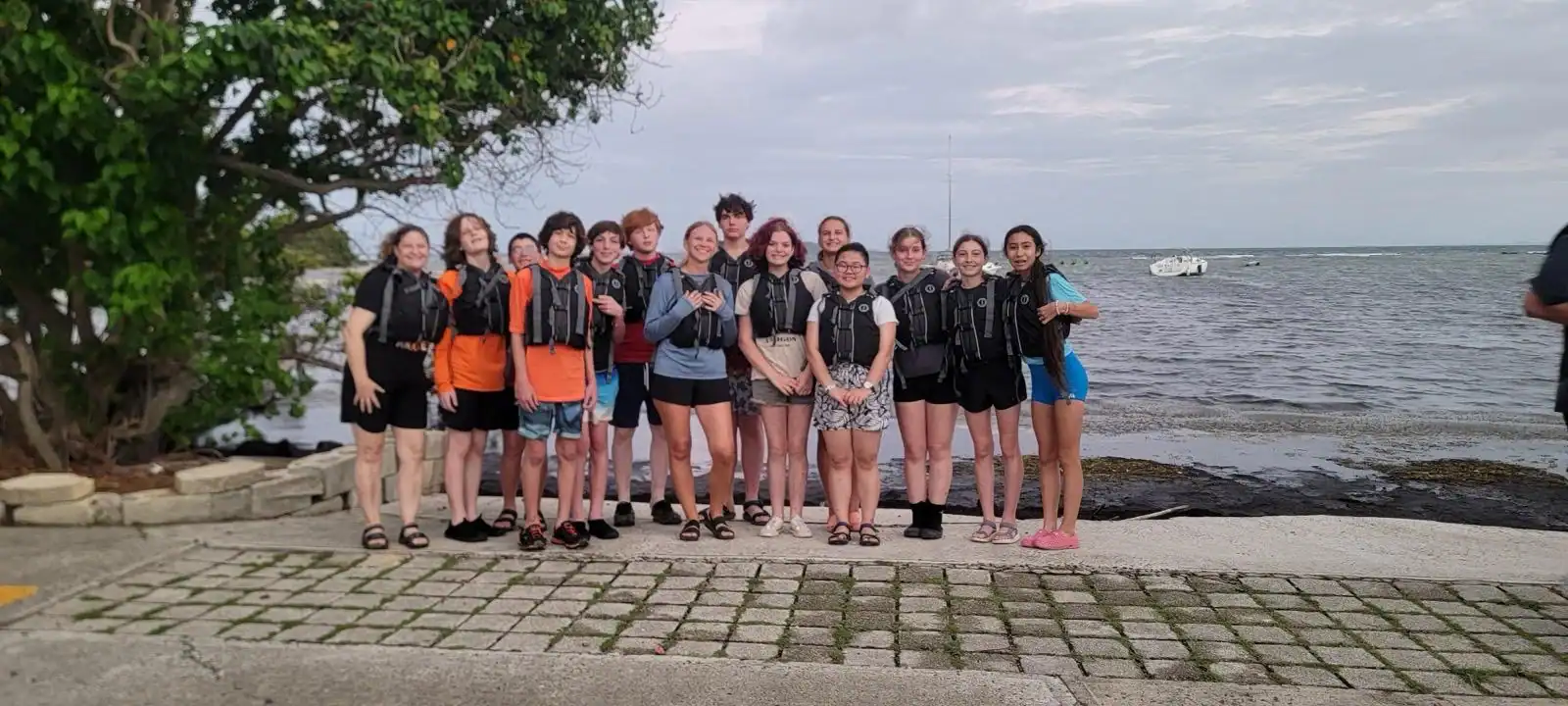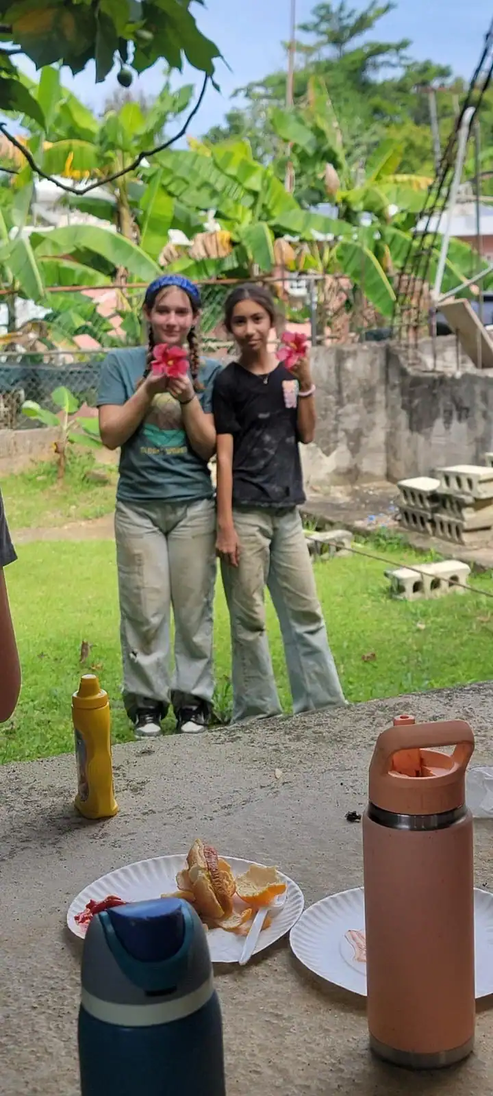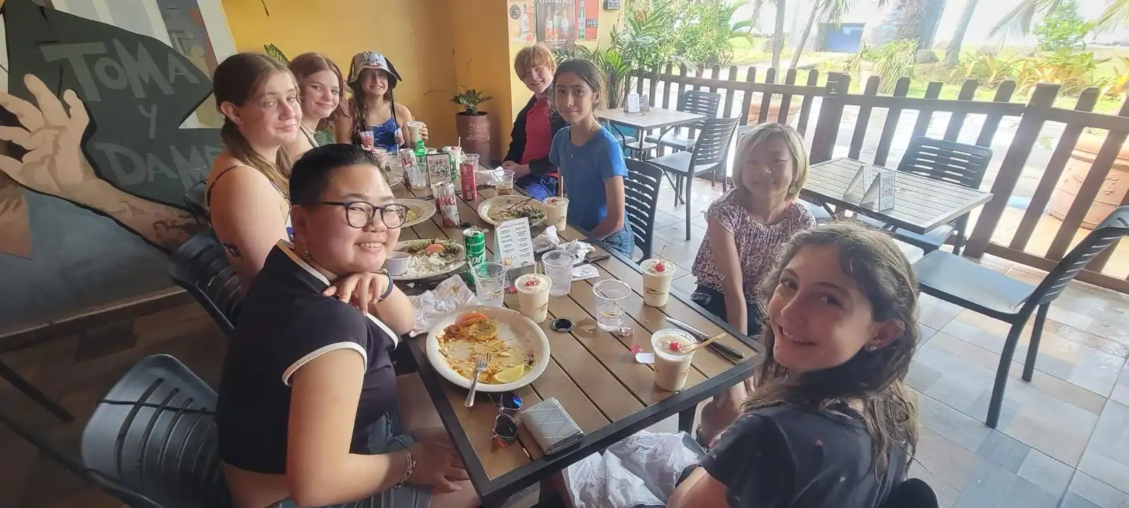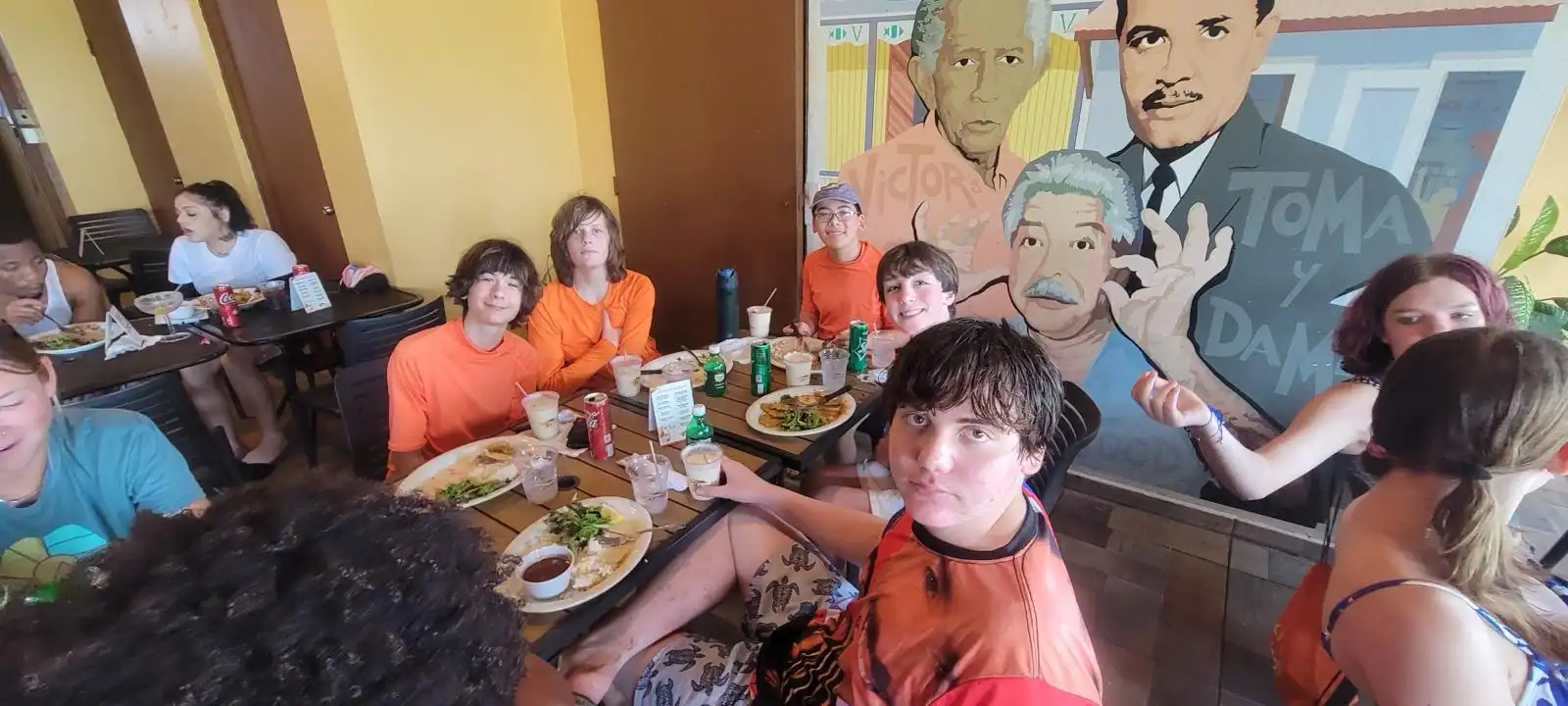 The group prepared thank you cards written to the community we worked with this last week. Once everything was ready, we spent time with Miss O and Miss Kim to reflect on our experiences with the community so far through journaling. For our final dinner at the Big Yellow House, we invited the community to share it with us. We had a delicious dinner of chicken breast, pork chops, yellow rice, and potatoes. After everyone had finished their food, our class played games with the other kids in the community. To close up our dinner, we had a final meeting about our overall thoughts on our three days at the work site. Before we said our final goodbyes, the community gave us each a bracelet as a thank you and as a reminder of our time here in Puerto Rico. After everyone left, we all pitched in to help clean up and turned in for our final night at the Big Yellow House. We cannot wait for our upcoming adventures during our last full day here in Puerto Rico!