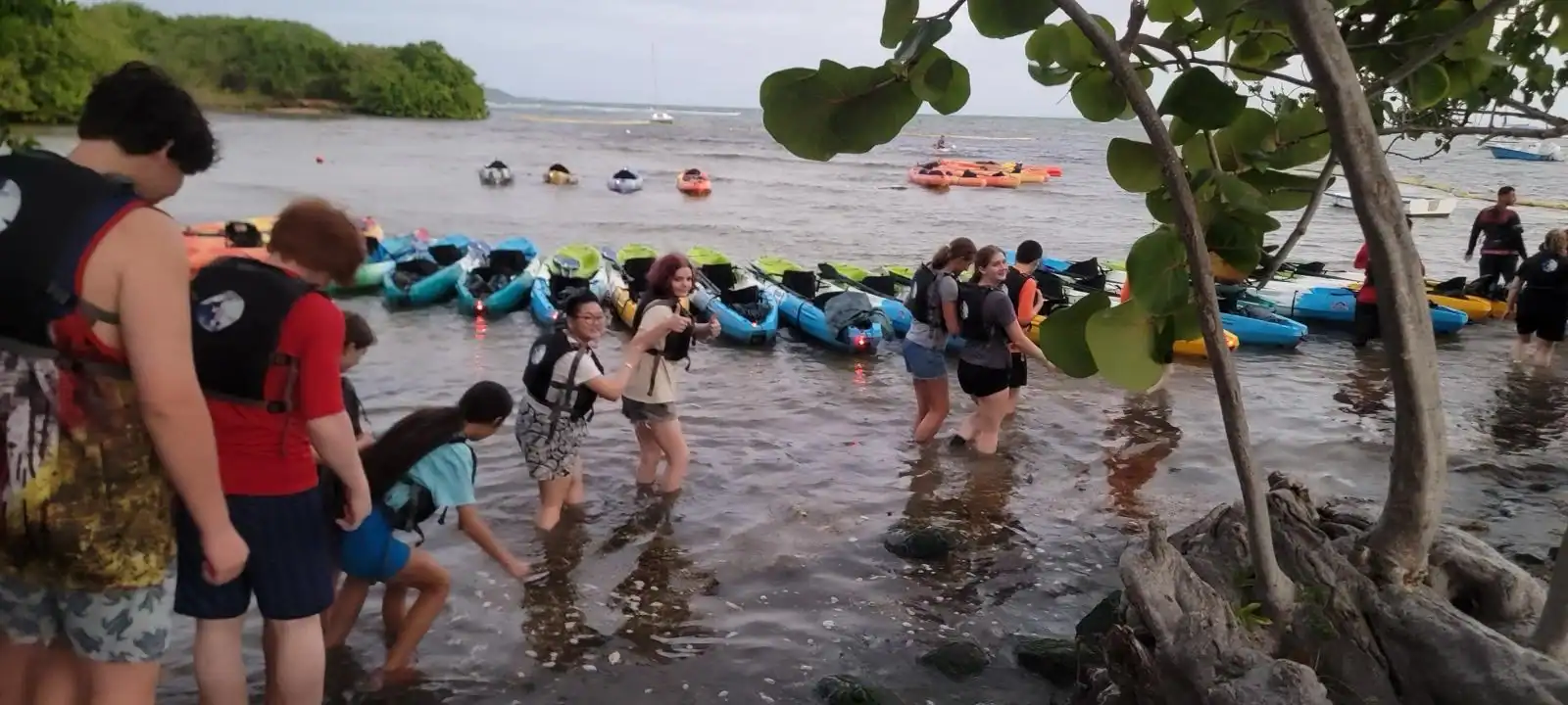 After the delicious lunch, we had an hour to visit and buy from the kiosks that were on the street. Once we were finished shopping we made the trip to the Casa Coral which is where we get to stay for one short night! There, we settled in and checked out the beach, we had an early dinner of pizza and got in the van one last time to head to the Biobay kayak tours. We paddled a mile and a half each way through tangled mangrove roots with our partners to see the bioluminescence of the microscopic things living in the bay. Back at Casa Coral, we shared about what we had learned on the trip and what we will take back home. We will miss our time here in Puerto Rico!