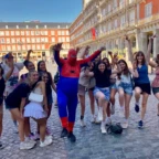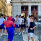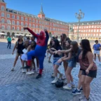 In the morning, we ate breakfast around 9 at the hostel. Before meeting our tour guide, Sebastian, we ran into Spider-Man on the street and took some fun pictures with him. After that, we met up with Sebastian and began our walking tour to learn about the city of Madrid. We explored the history of Spain, saw both historic and modern landmarks, and had a lot of fun along the way!