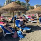 After the caves, we went to Nerja beach. For lunch, we had a typical menu with a first, second, and third course. It included paella, salad, spaghetti, hake, chicken, and gazpacho. For dessert, it was either brownie or chocolate cake. Then we walked down to the beach. The water at Nerja Beach was very clear, and the landscape was beautiful. The water wasn’t as cold as the beach in Barcelona though.