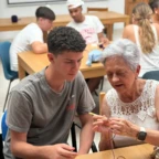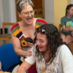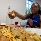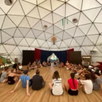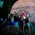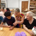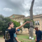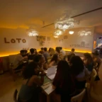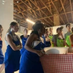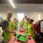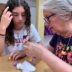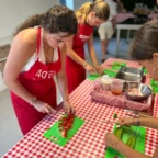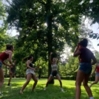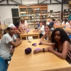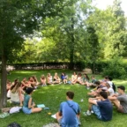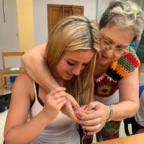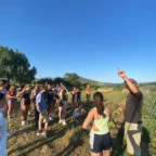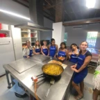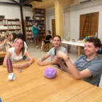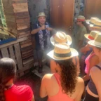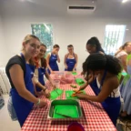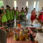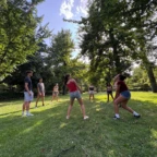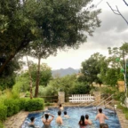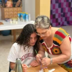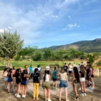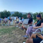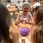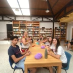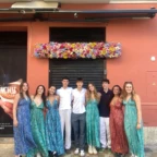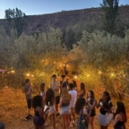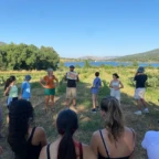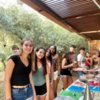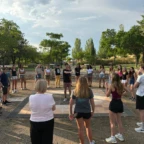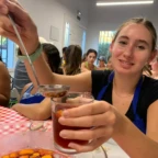 Some of us started off the day with a quick run at sunrise. The view of the sun peeking through the mountains was beautiful. After breakfast, we headed to La Finca for a class with Matteo where we learned how to express ourselves via expression, dancing, and body language. We were gifted red clown noses in colorful handmade boxes. Afterwards, we had a restful hour on the riverbank, cooling off and skipping stones. The gracious hosts of La Finca prepared us a delicious make-your-own pasta salad buffet. After a busy day yesterday, we were given a proper siesta for pool time and rest. Later in the afternoon we headed to the Dílar community center to learn how to crochet from local masters. We crocheted with purple string to represent female empowerment and the fight against domestic violence. We were gifted crochet butterflies before walking through the picturesque streets of Dilar and seeing the crocheted awnings woven by the local women. Finally, we headed back to a park near the hotel to eat dinner that our hosts prepared for us and picnic under the stars. We finished off the night with games with the locals and each other – it was a great day!