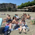 When we actually got to the beach, it was really rocky and hot so we had to run into the water, which was also rocky but not hot so it was nice. The rocks had a bunch of algae on them so they were pretty slippery, and there were also a ton of fish around that got really close but no one caught them. I think we were messing around a bit and then went to this big raft. We jumped off the raft a ton as Patrick patrolled around us. Eventually, everyone else came around the raft and we were all treading water and I learned that I couldn’t tread water well.