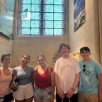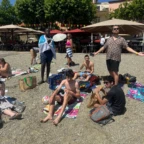 We woke up bright and early, after our intriguing nights celebrating the Fête de la Musique (World Music Day) with our families. At first our plan was to do service work cleaning up an historical French path way, but as the weather app predicted an extreme heat wave Katie and Patrick quickly pivoted to go to a lake about 30 miles outside of Carcassonne. There we found out a very interesting fact, weather apps can be in fact very wrong. As we arrived to the lake we found it covered with mist making the clouded sky and the water blend to one grayish color. Shivering with our short sleeves and bathing suits, after a quick weather check we discovered the lakes amusements – like the little pirate ship where we swung trying to avoid the iciness of the water. As the day progressed at the lake some people decided to run/pretend to run around the lake, played trivia, ate our lunch made by our host families, celebrated Mumbi’s 15th birthday with balloons and cake, and played mini golf at the shack across the street. Unfortunately I lost by 9 but it was an extremely unforgiving game as one person got well over 200 at just 16 holes.
