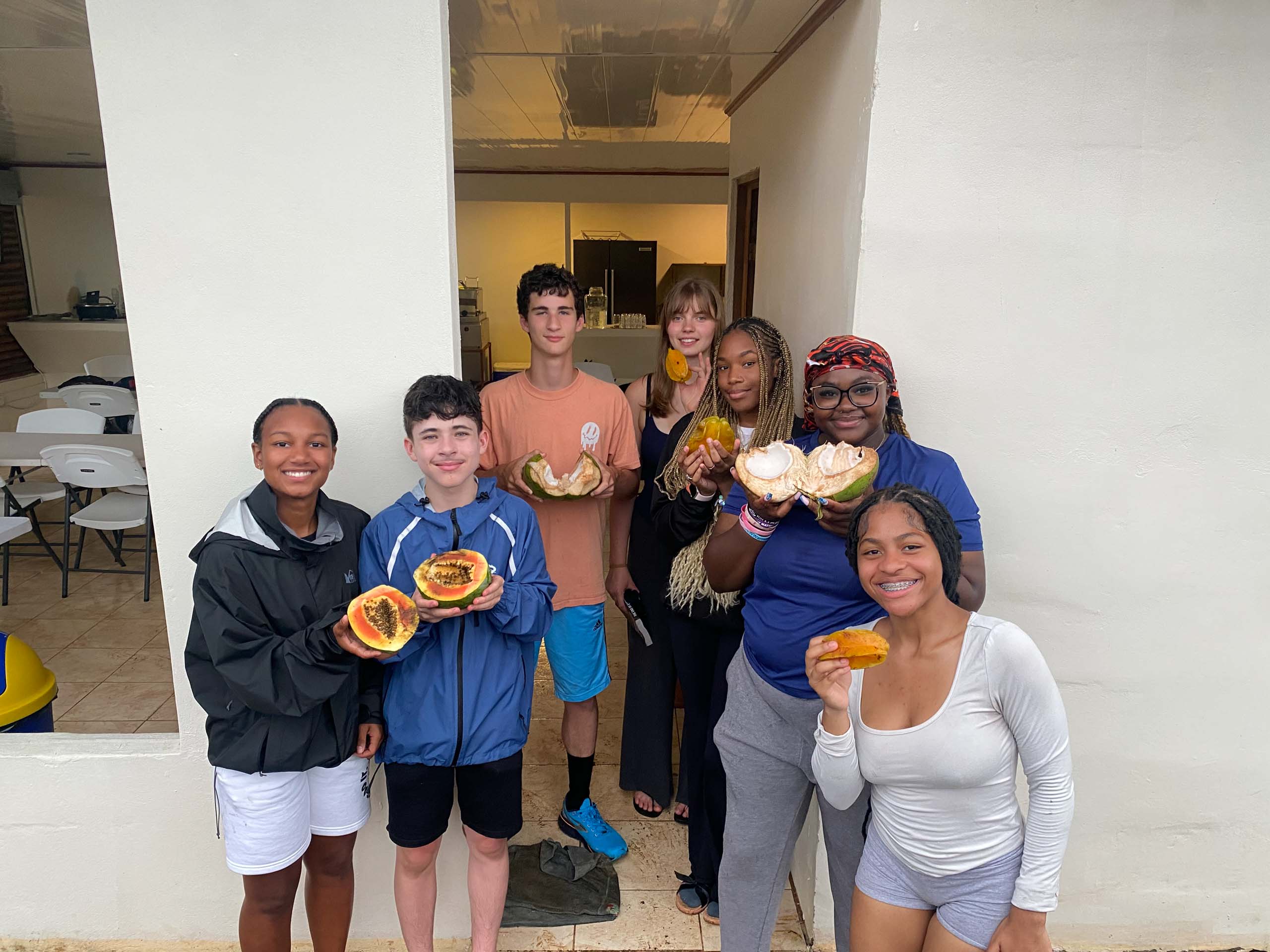 A group of six people standing outside a building, holding pieces of fruit and smiling at the camera.