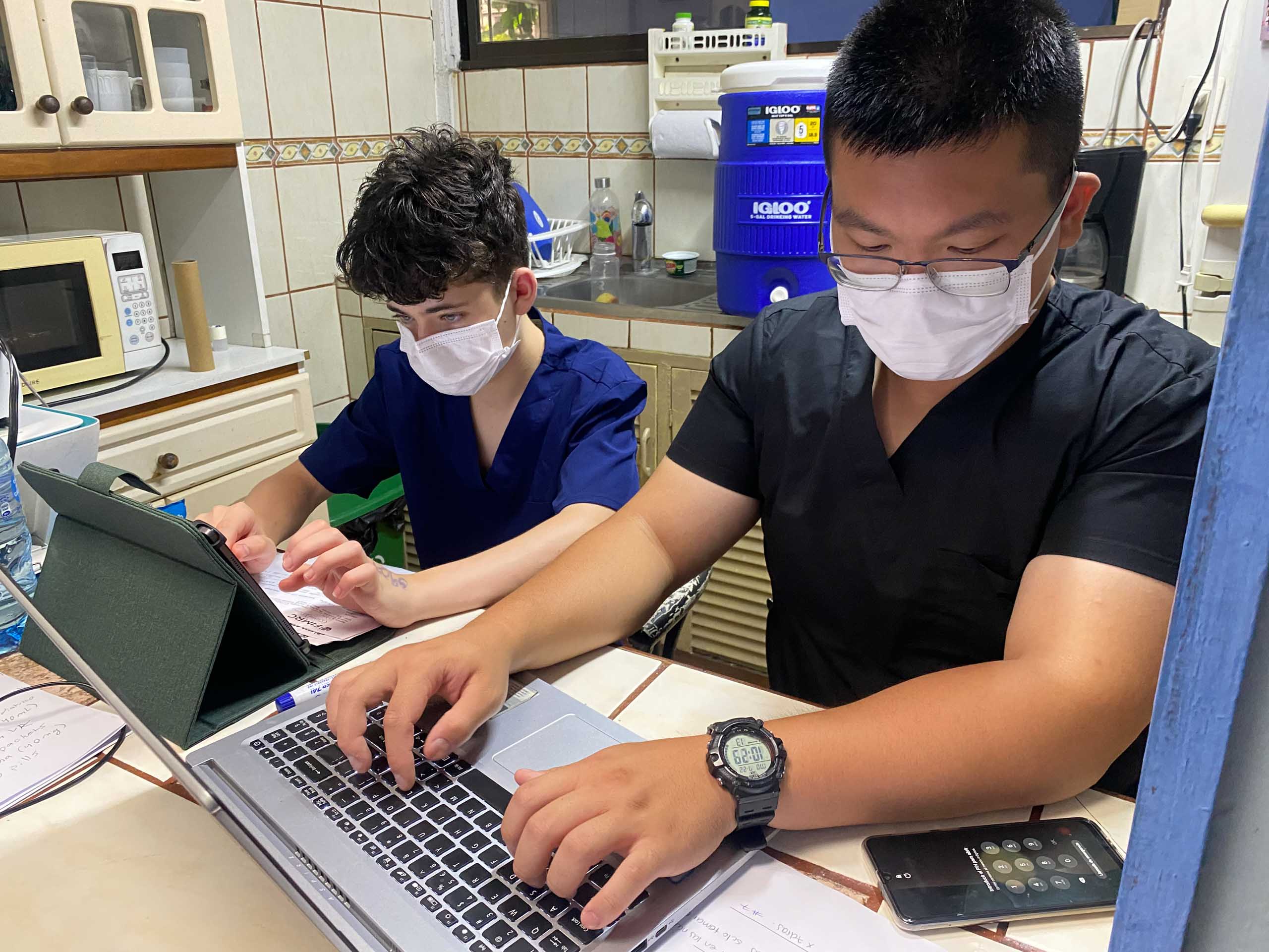 Two people wearing face masks work on a laptop and papers at a kitchen table, with a microwave and water cooler in the background.