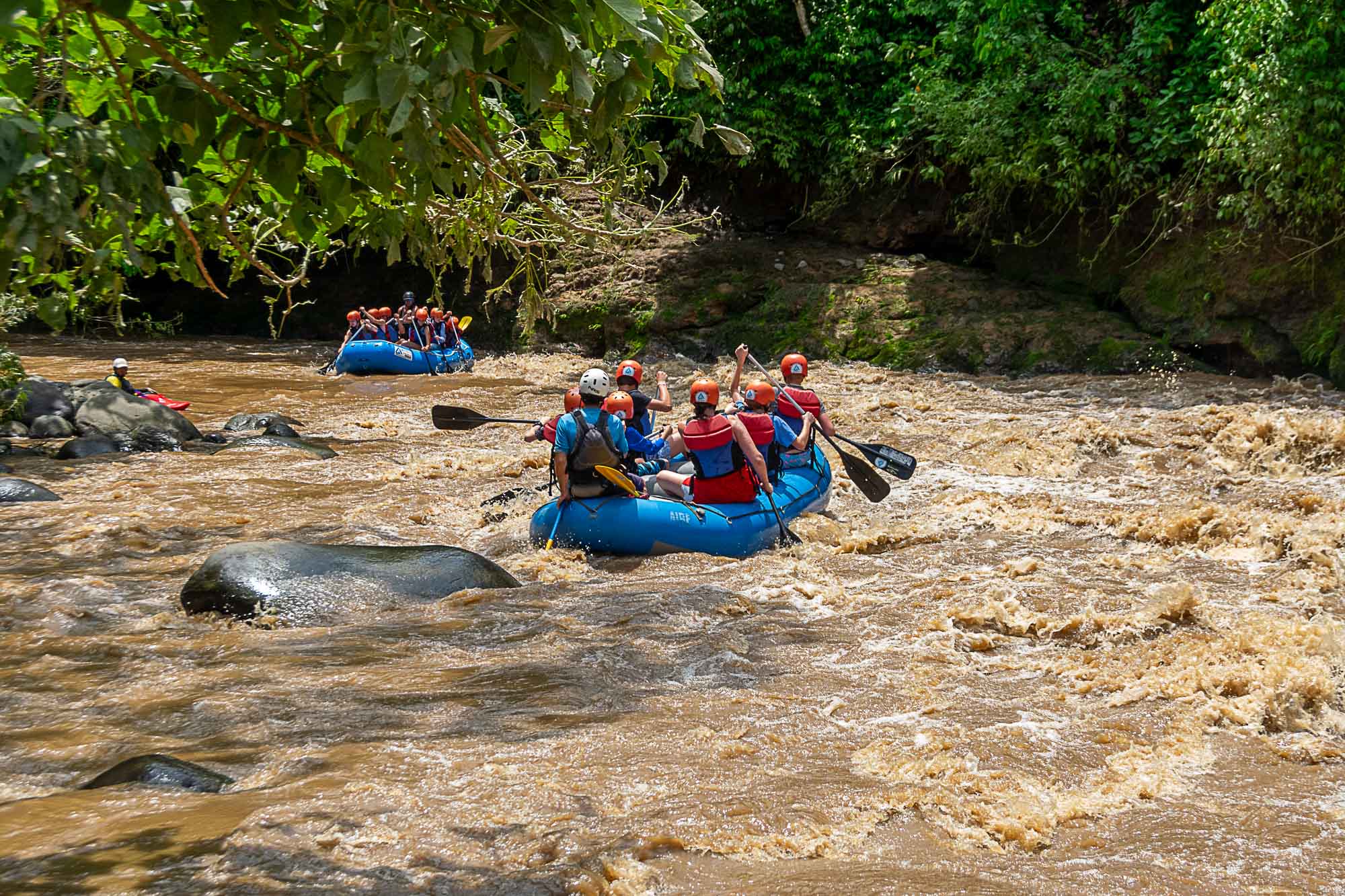 People wearing life jackets are rafting down a turbulent river surrounded by lush greenery.