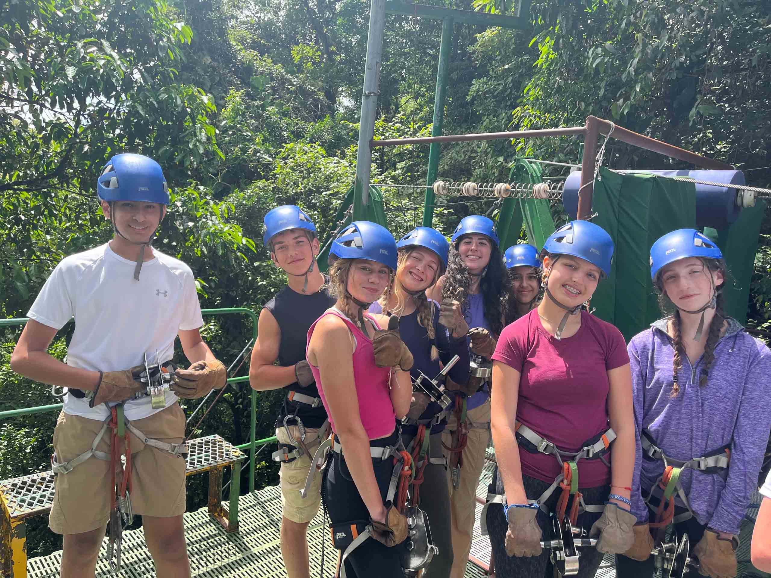 A group of people wearing helmets and harnesses, standing on a platform in a forest setting, preparing for a zip-lining activity.