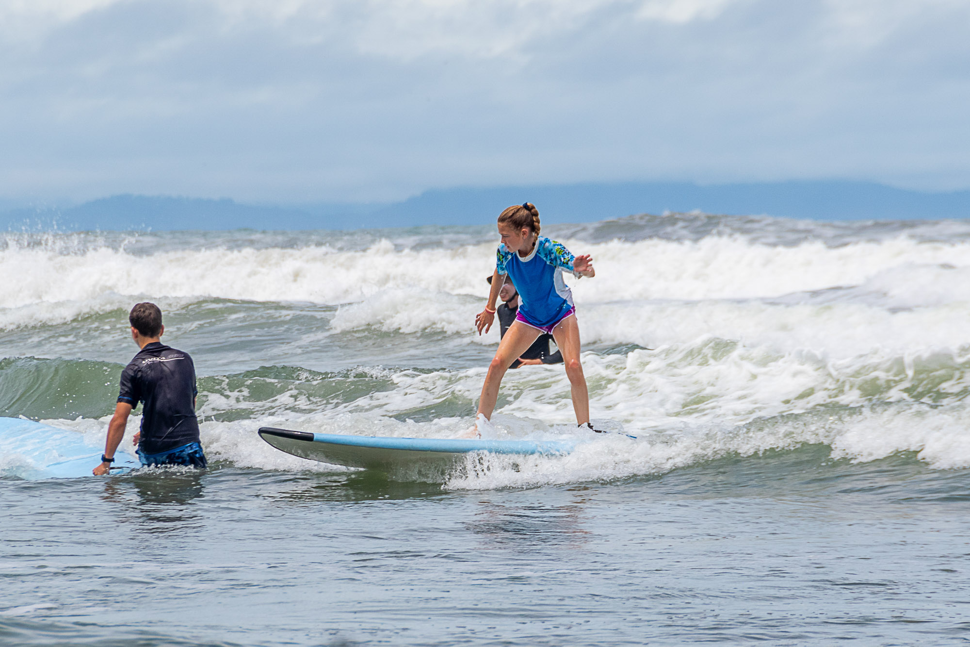 A child in a blue shirt practices surfing on a small wave, while an adult in the water offers assistance.