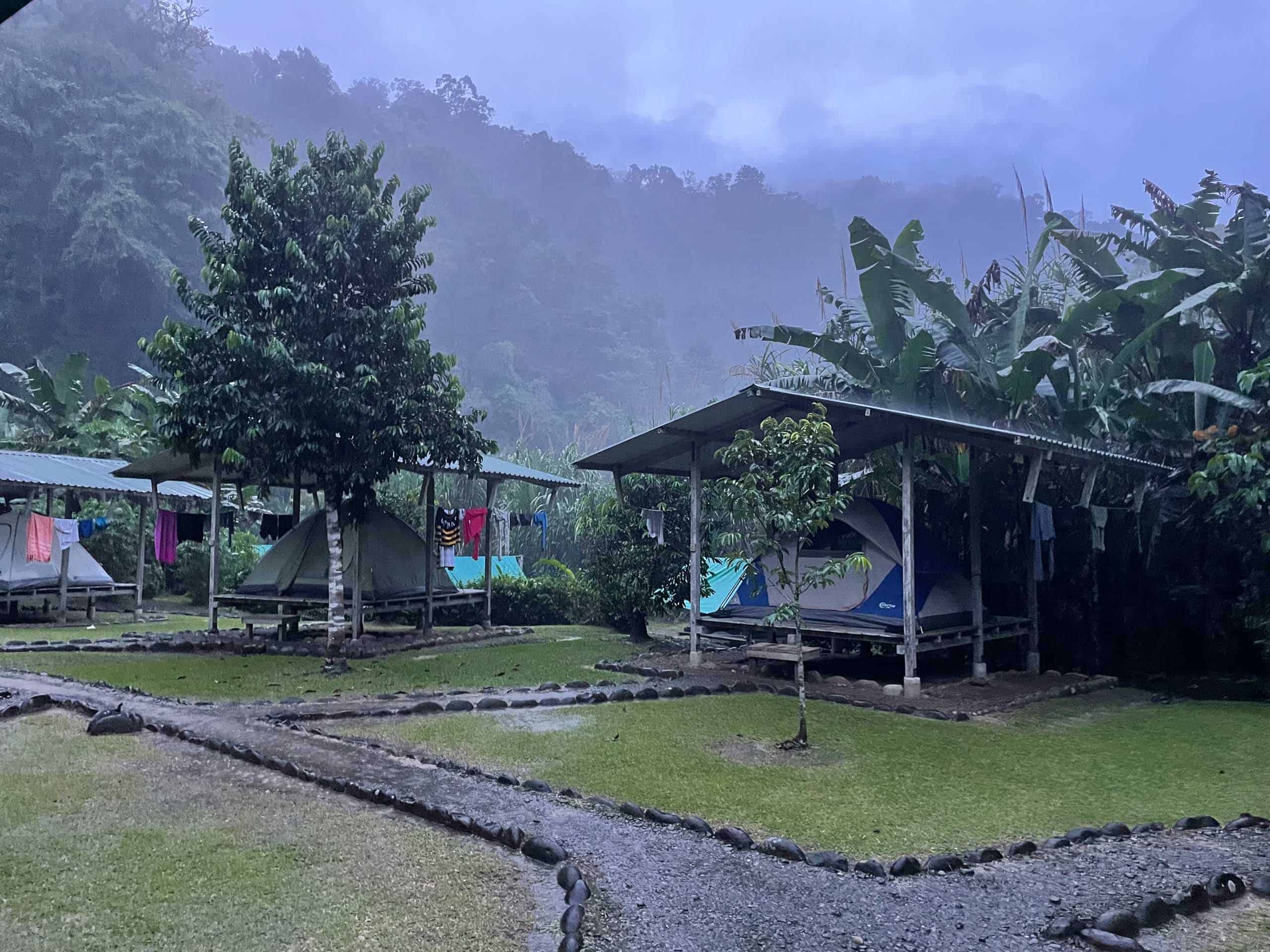 Tents set up on platforms in a misty, forested campground with gravel paths and trees.