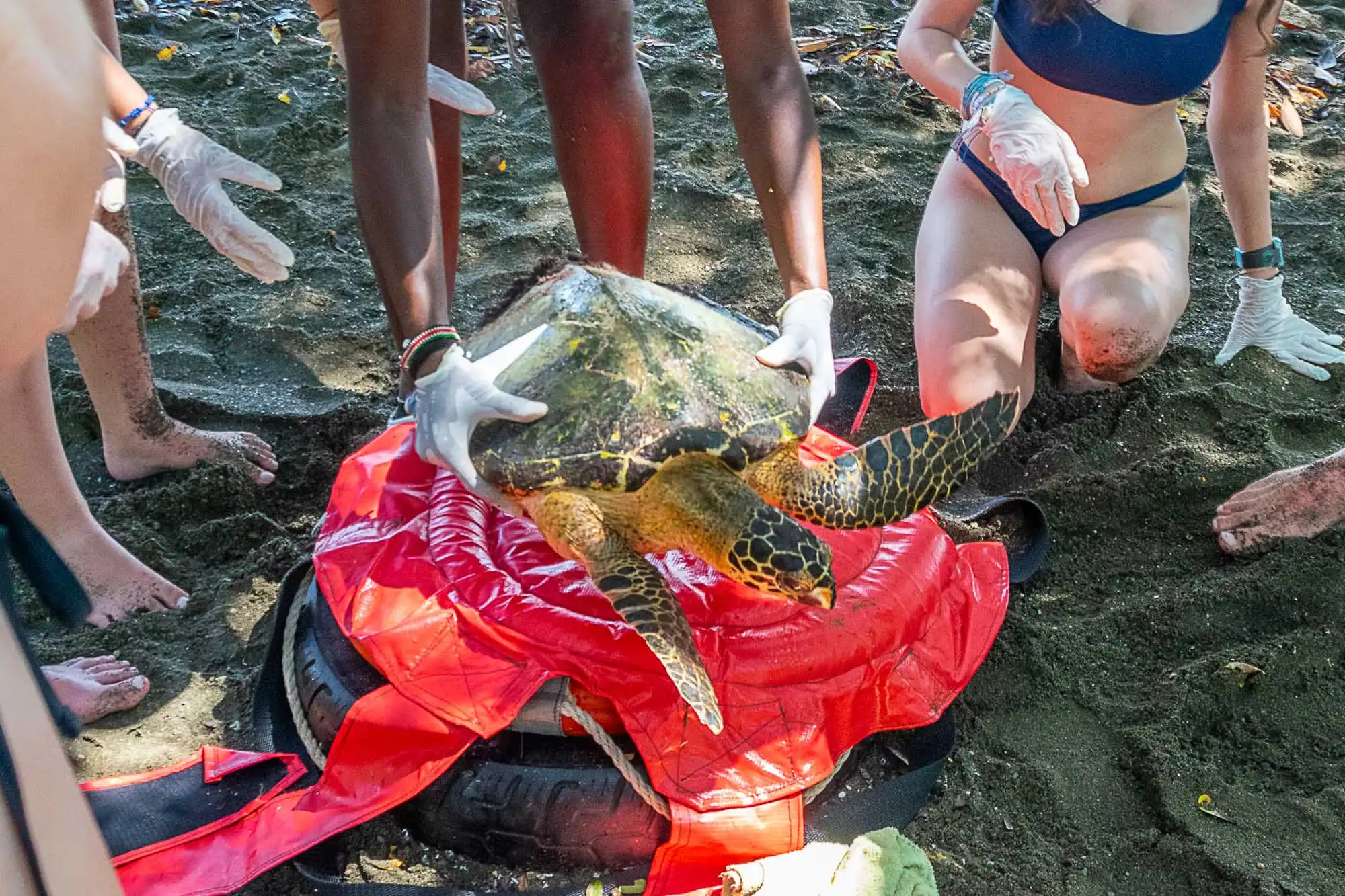 During a teen wildlife trip, several people wearing gloves release a sea turtle onto a sandy beach, using a red mat and a tire for support.