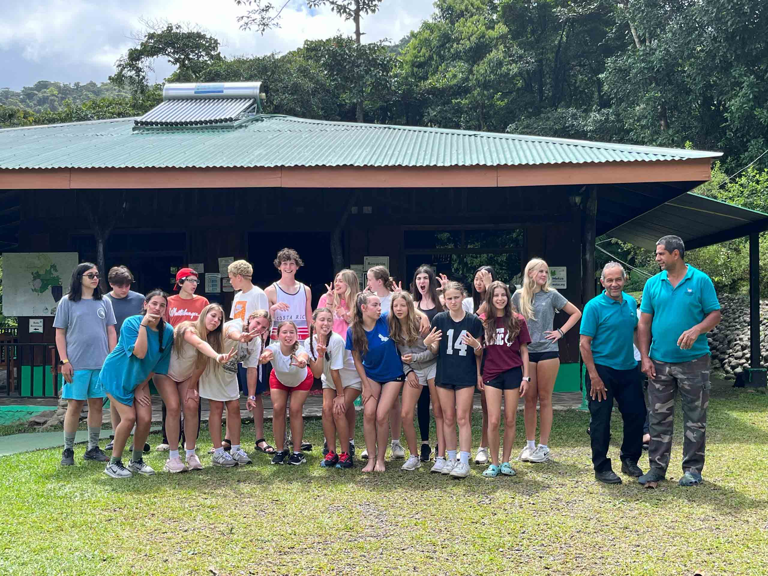 A group of people poses in front of a wooden building with a green roof surrounded by trees.