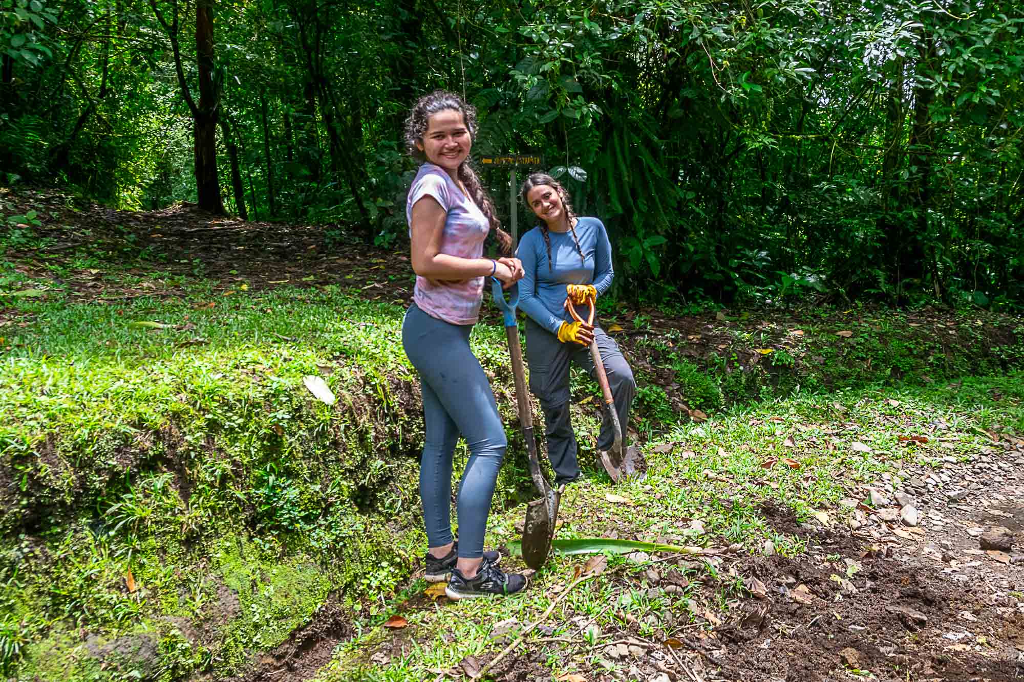 Two people in casual clothing are standing on a grassy path in a forested area, holding shovels and smiling at the camera.