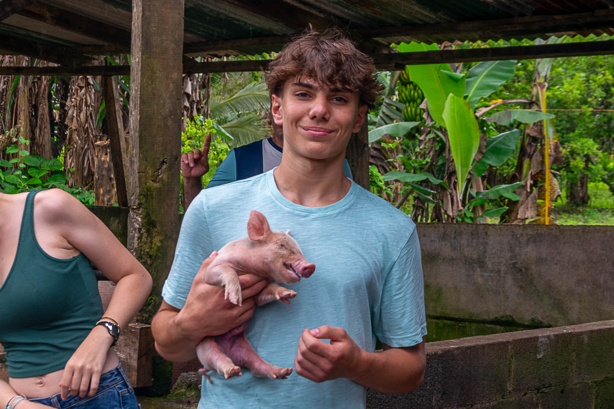 A young person in a blue shirt holds a piglet in an outdoor setting with greenery and a wooden structure in the background.