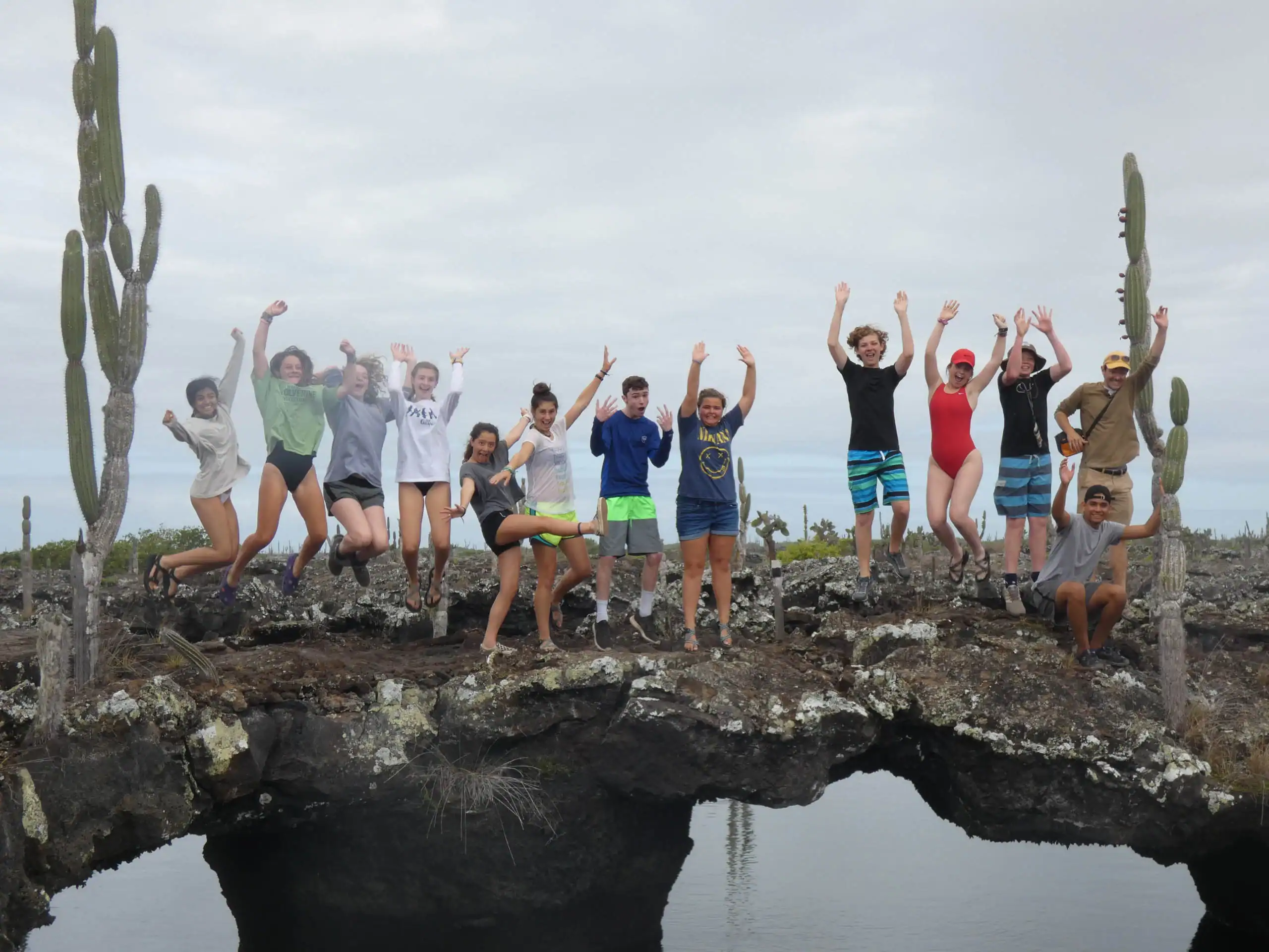 A group of people jumps in unison on a rocky bridge surrounded by cacti and water.