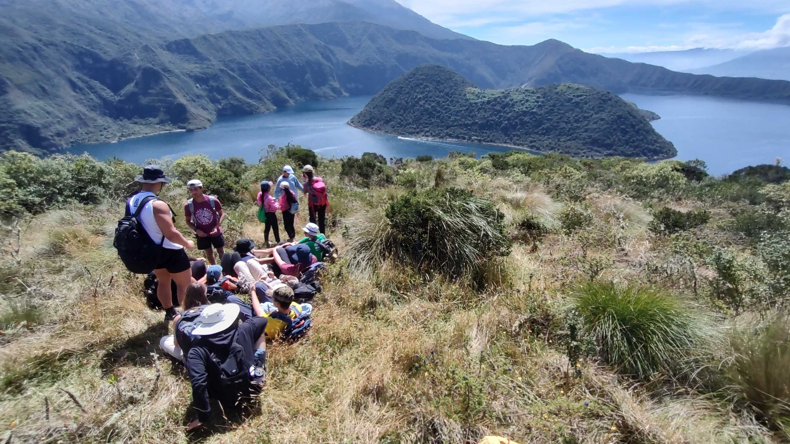 Group of hikers resting on a grassy hill overlooking a lake and mountainous landscape under a clear sky.