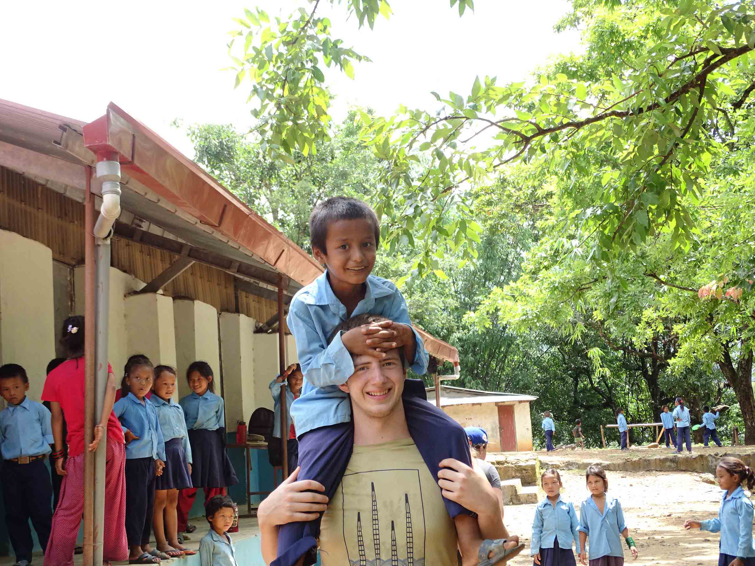 A child wearing a blue shirt sits on a man's shoulders outside, surrounded by other children in a schoolyard. Trees and a building are in the background.