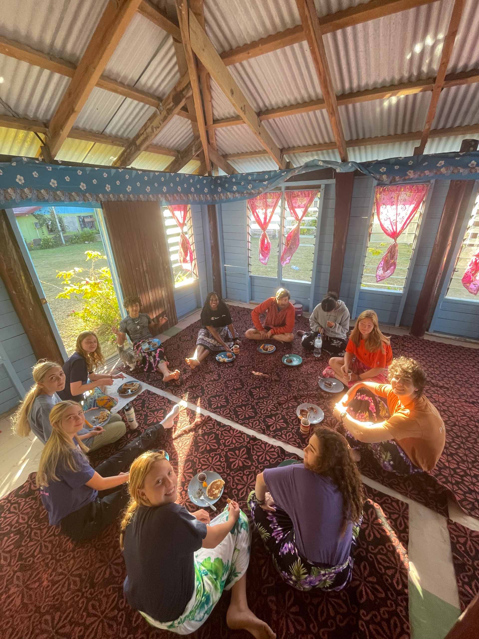 A group of people sit on a decorated floor in a room with red curtains, sharing a meal from plates placed in front of them.