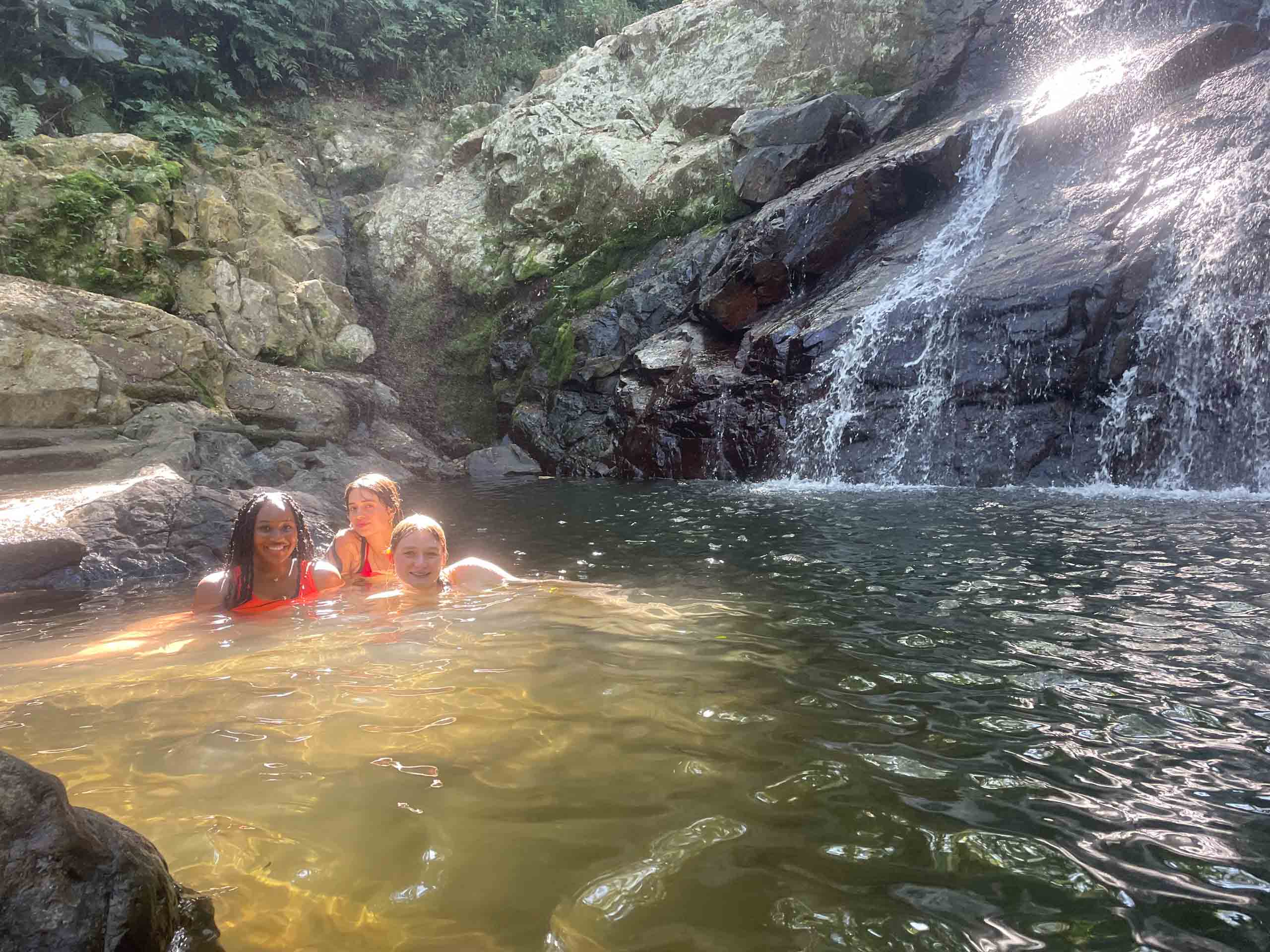 Three people swimming in a natural pool under a small waterfall surrounded by rocks and greenery.