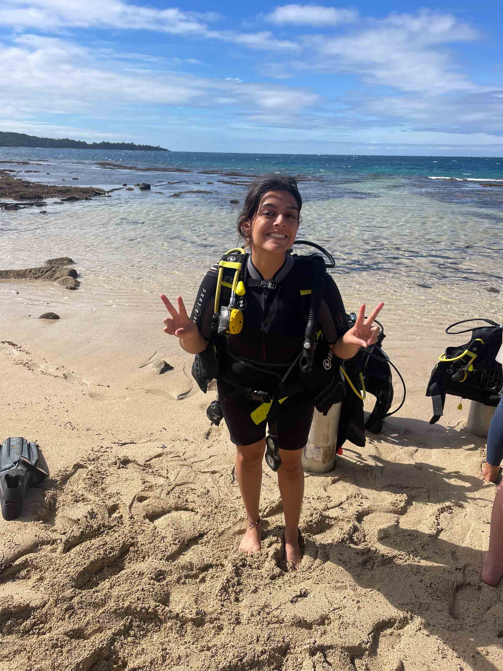A person in a wetsuit and scuba gear stands on a sandy beach, smiling and making peace signs. Ocean waves are visible in the background.