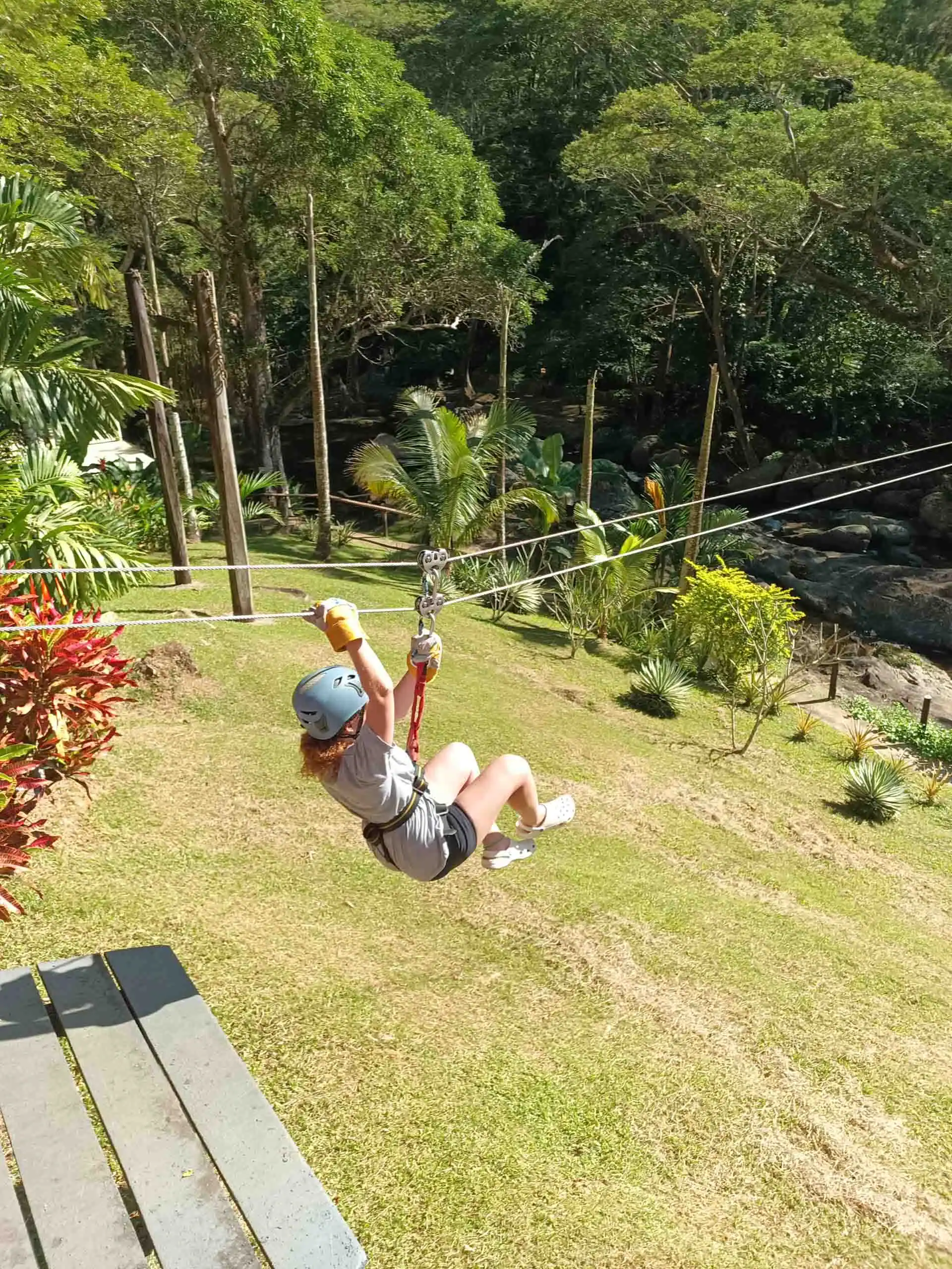 A person wearing a helmet and gloves rides a zipline over a grassy area surrounded by trees and plants in daylight, capturing the thrill of adventure on a Fiji student trip.