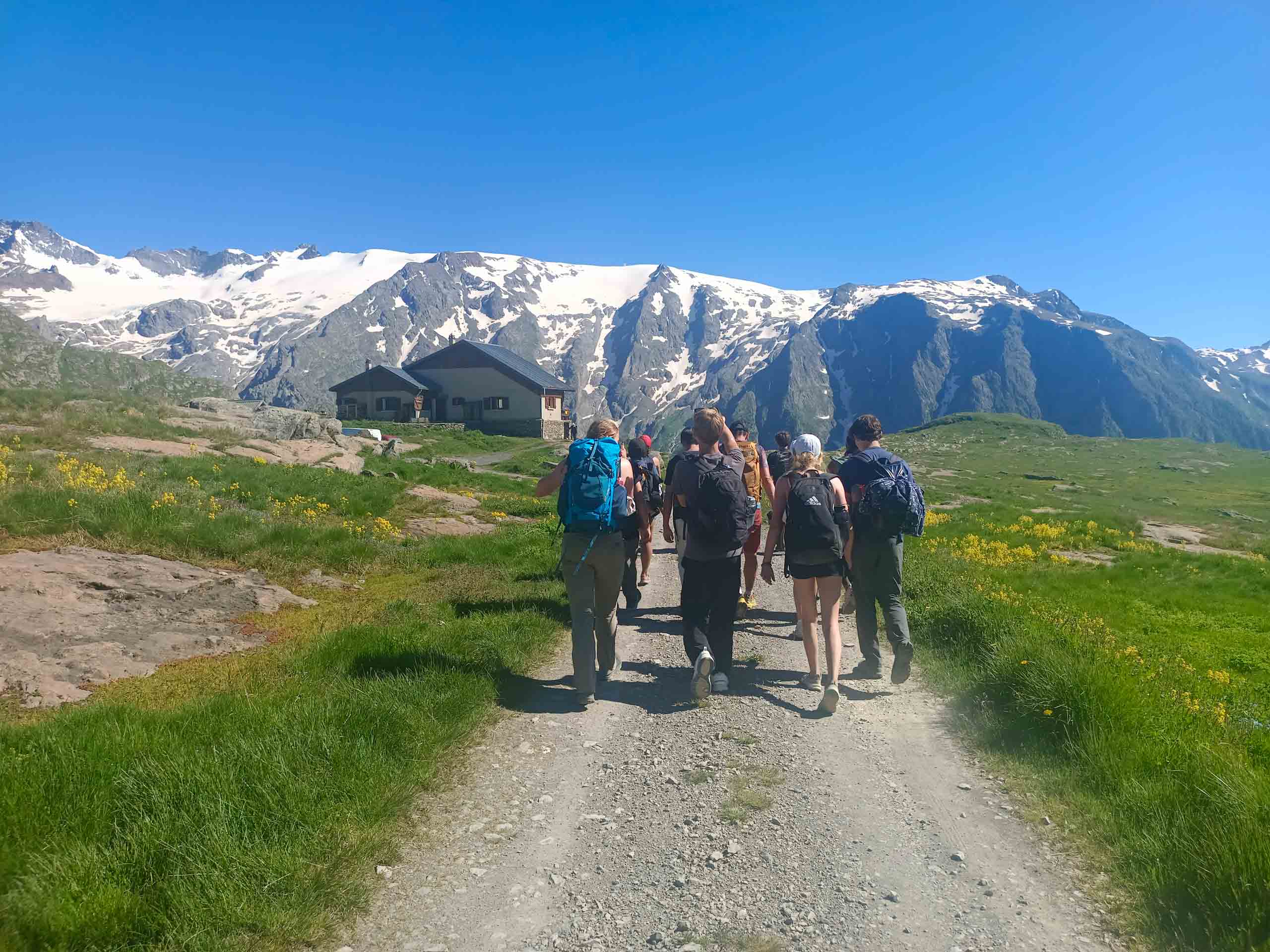 A group of hikers walks on a dirt trail toward a cabin, with snow-capped mountains in the background under a clear blue sky.
