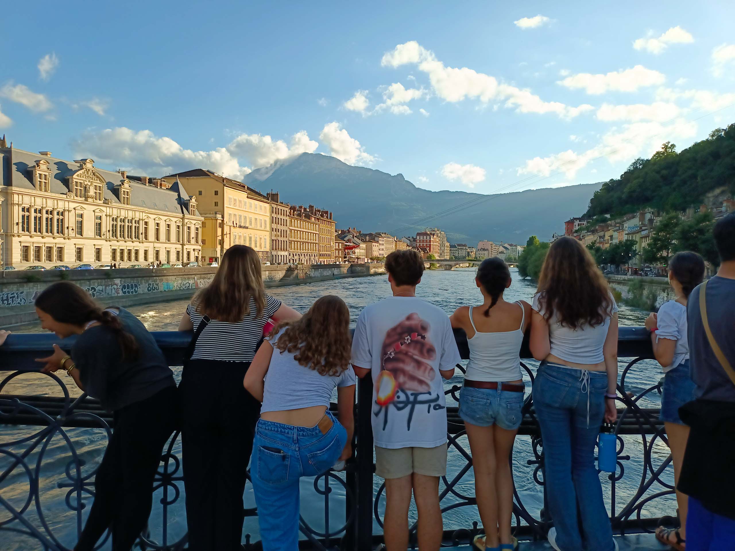 A group of people stand on a bridge railing, looking out over a river, with mountains and buildings in the background under a partly cloudy sky.