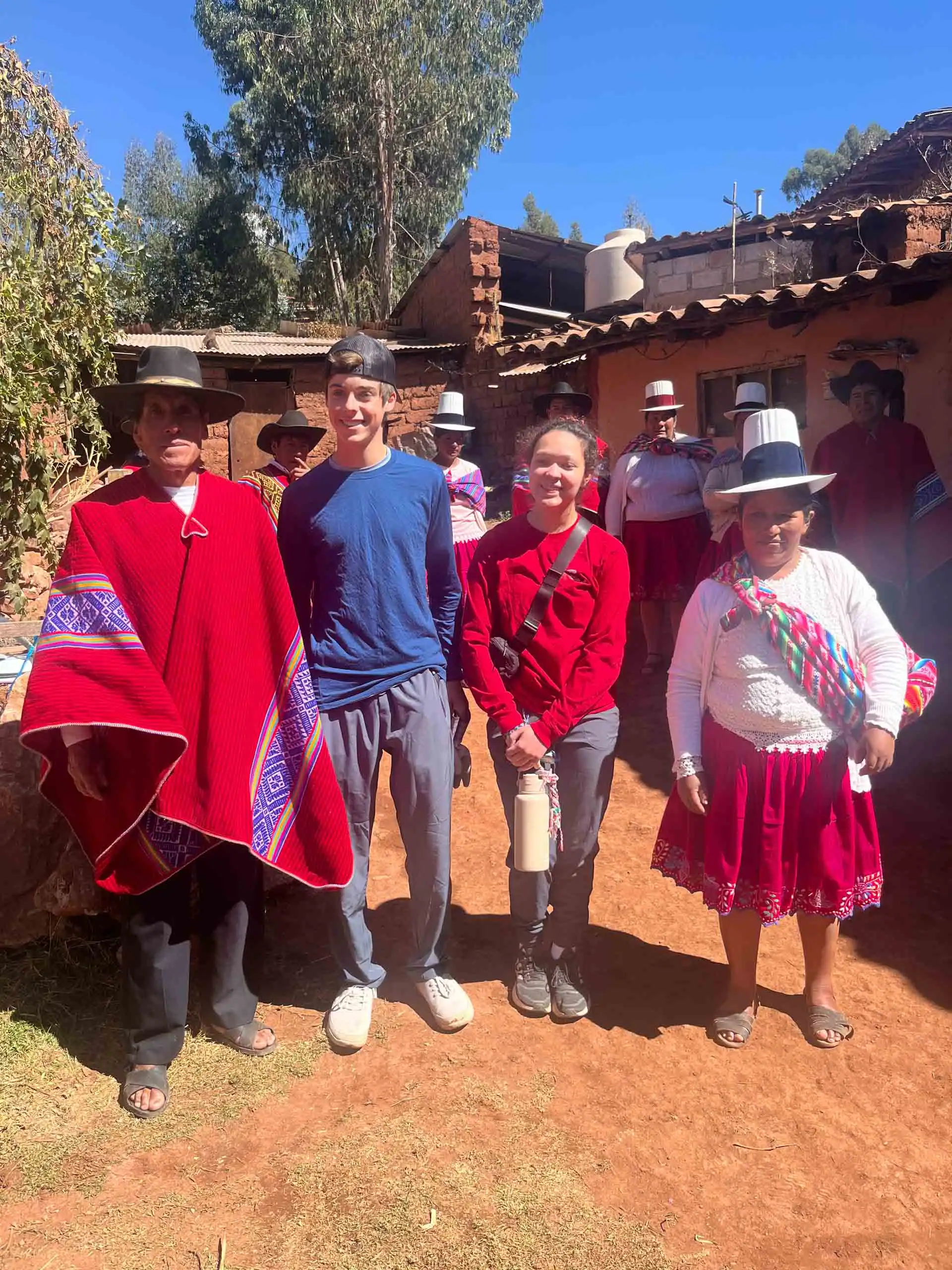 A group of people stands outdoors. Some wear traditional clothing, including red garments and hats, while others wear casual attire. They are on a sunny day near a rustic building.