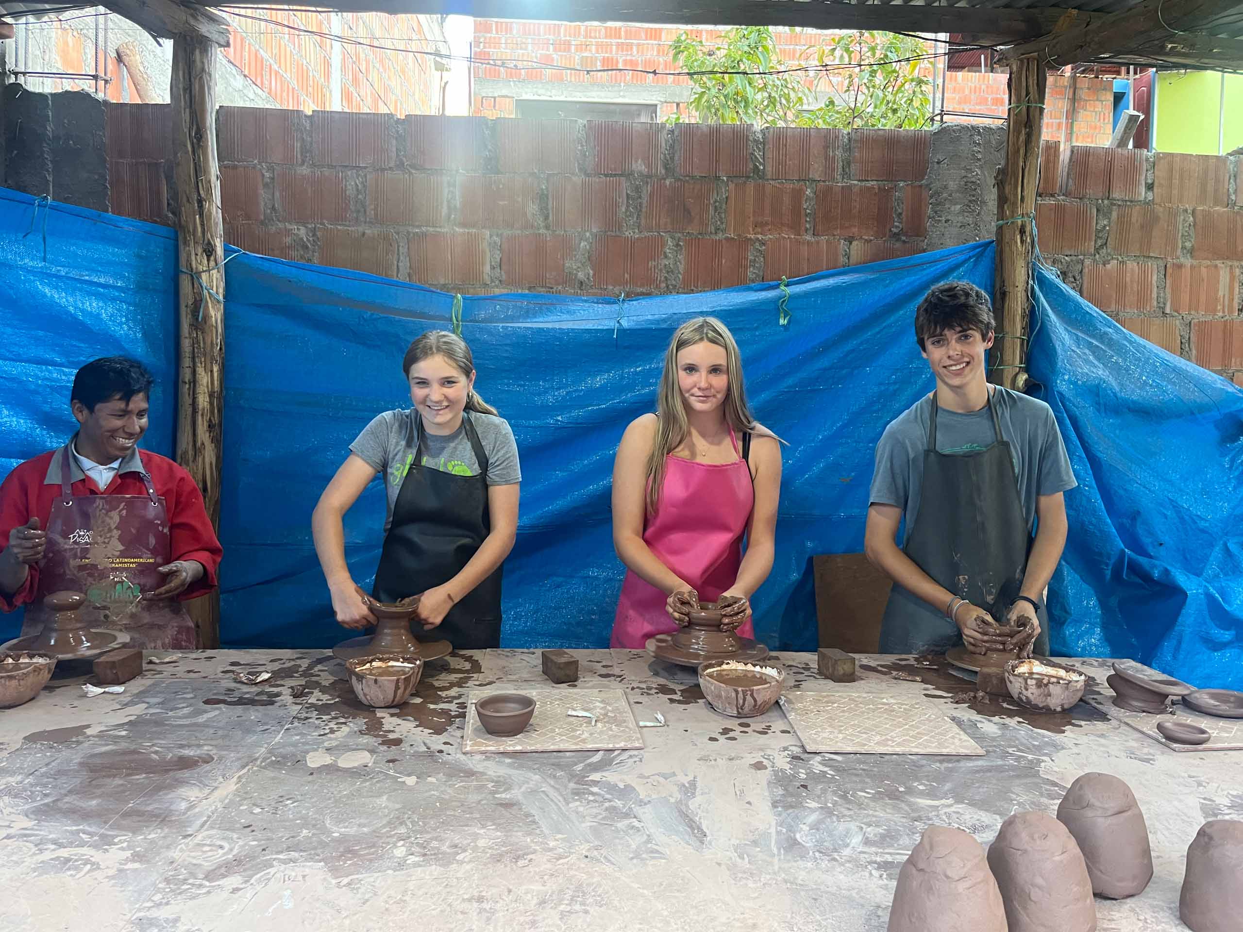 Four people at a pottery workshop, each shaping clay on a table. They are under a blue tarp with red brick walls in the background.