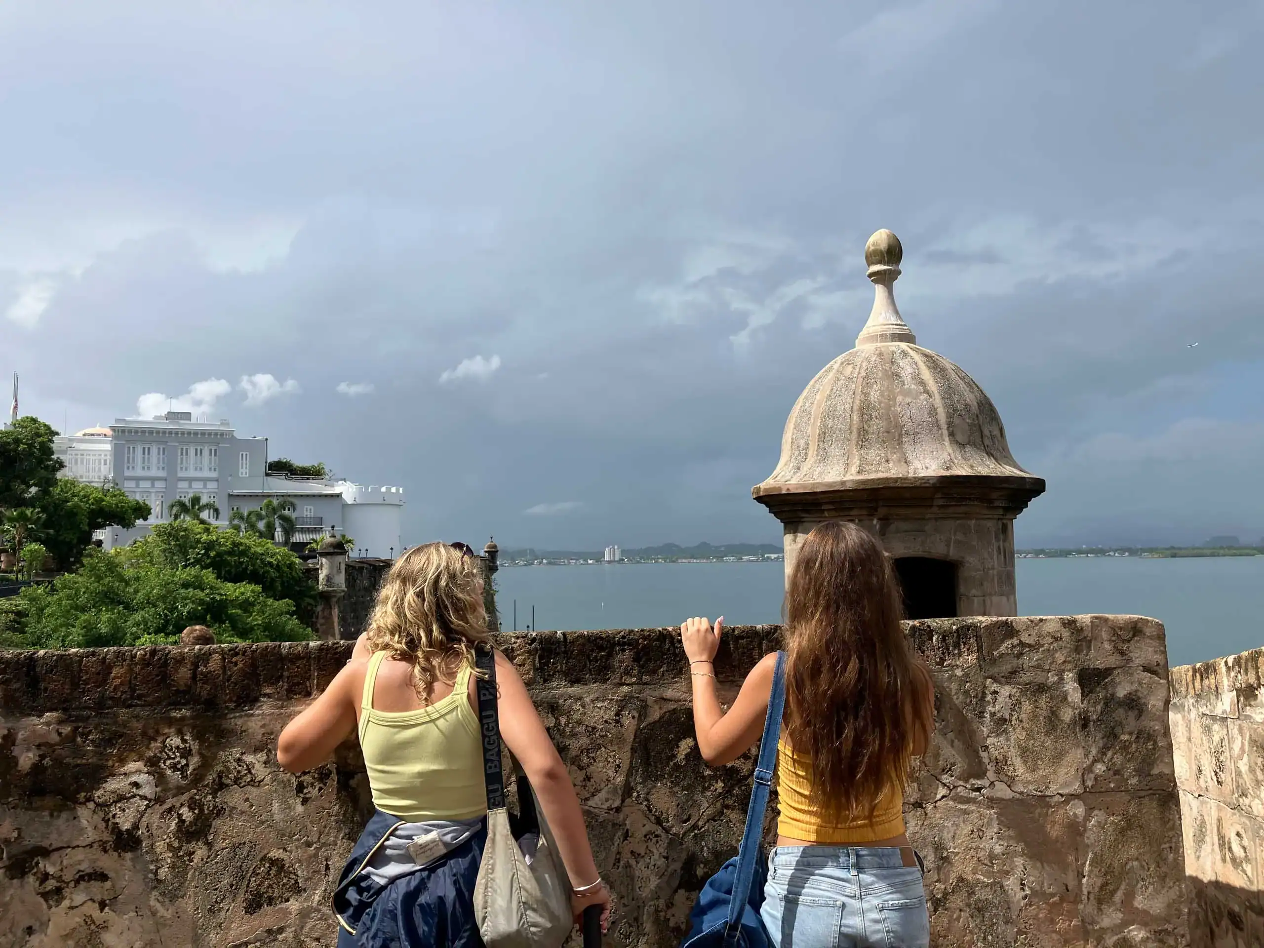 Two women with bags stand next to a historic stone building overlooking a body of water under a cloudy sky.