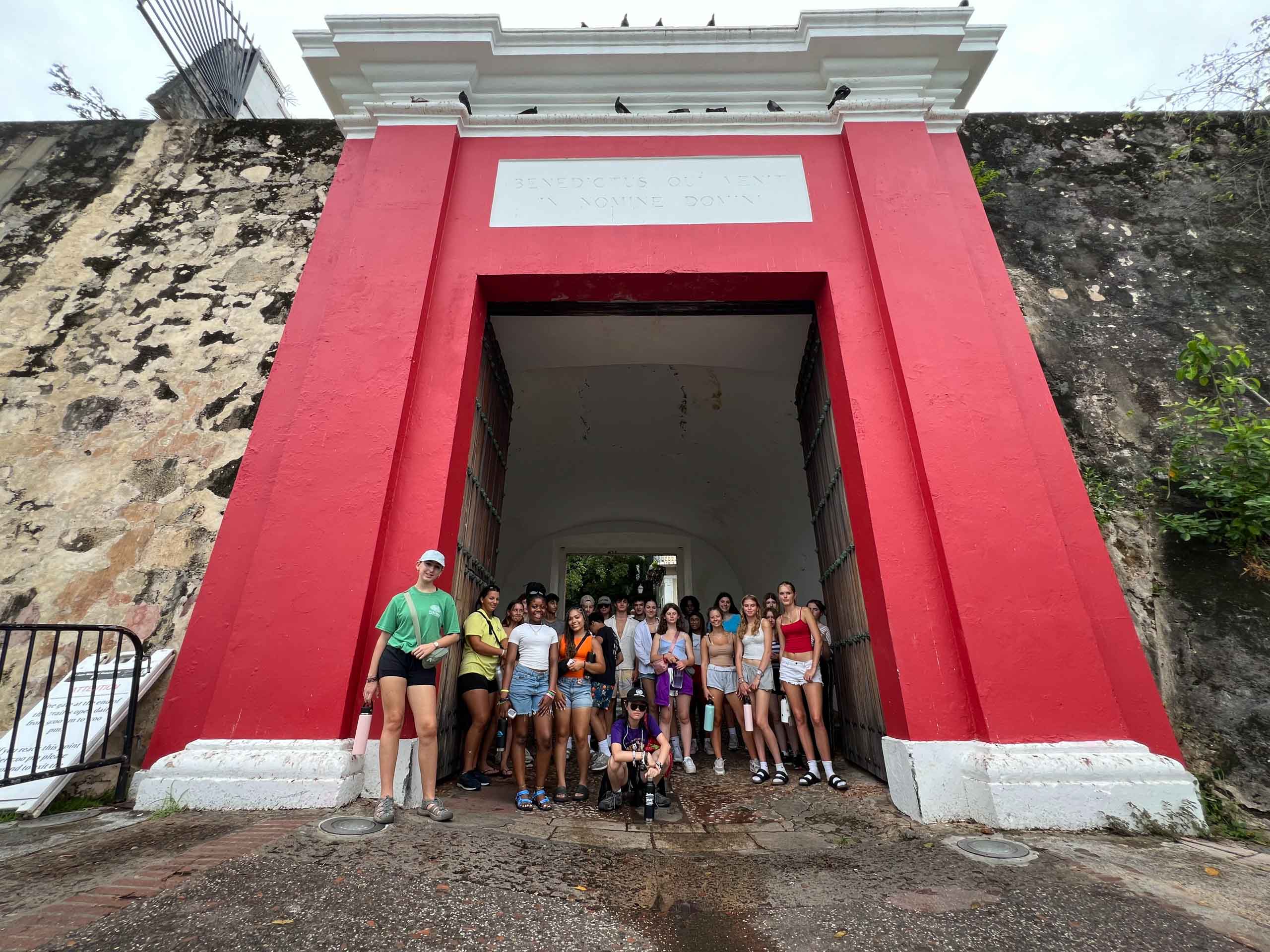 A group of people stand in front of a red historical archway with a plaque above.