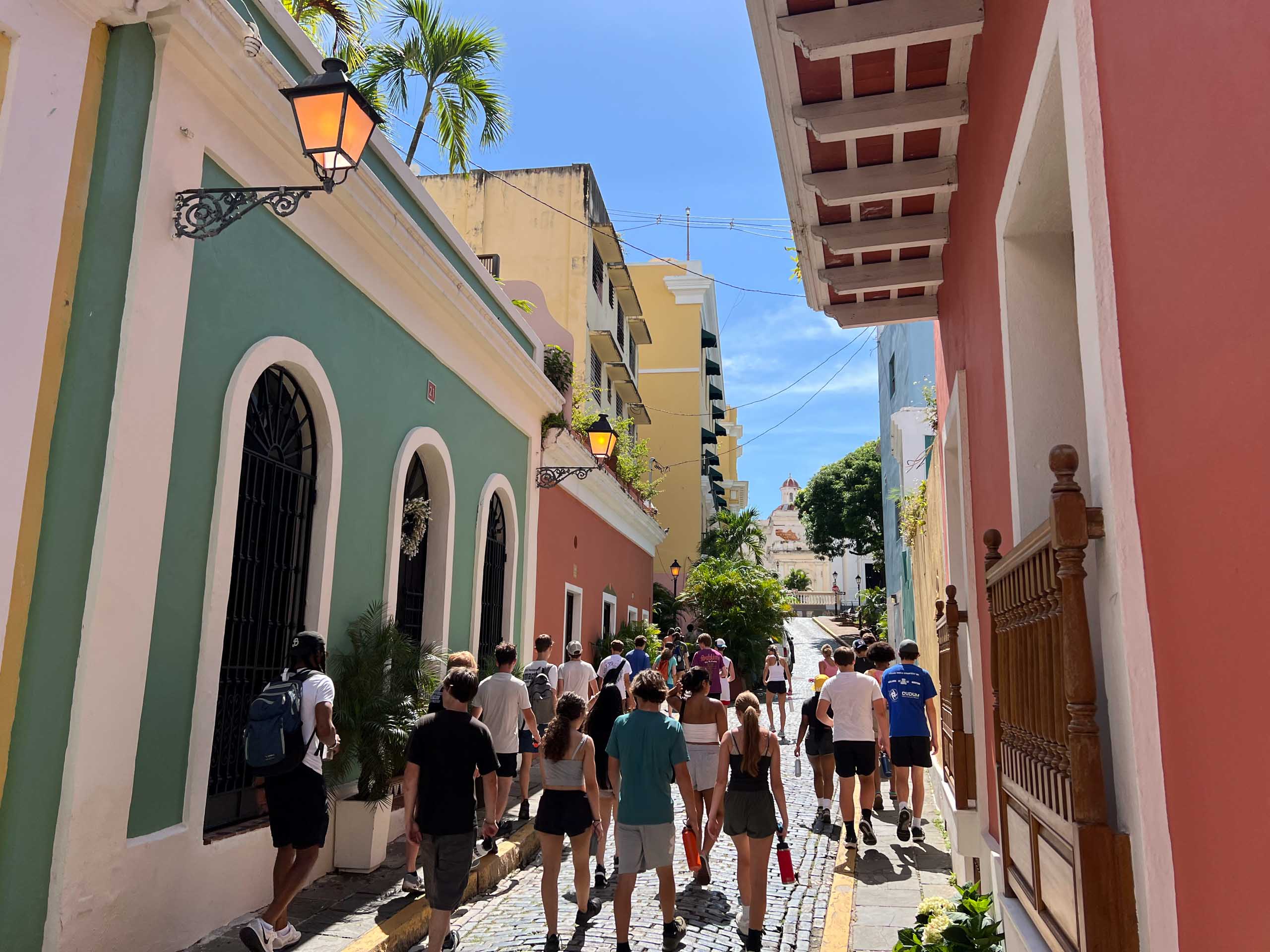 People walking down a narrow street lined with colorful buildings, under a clear blue sky.