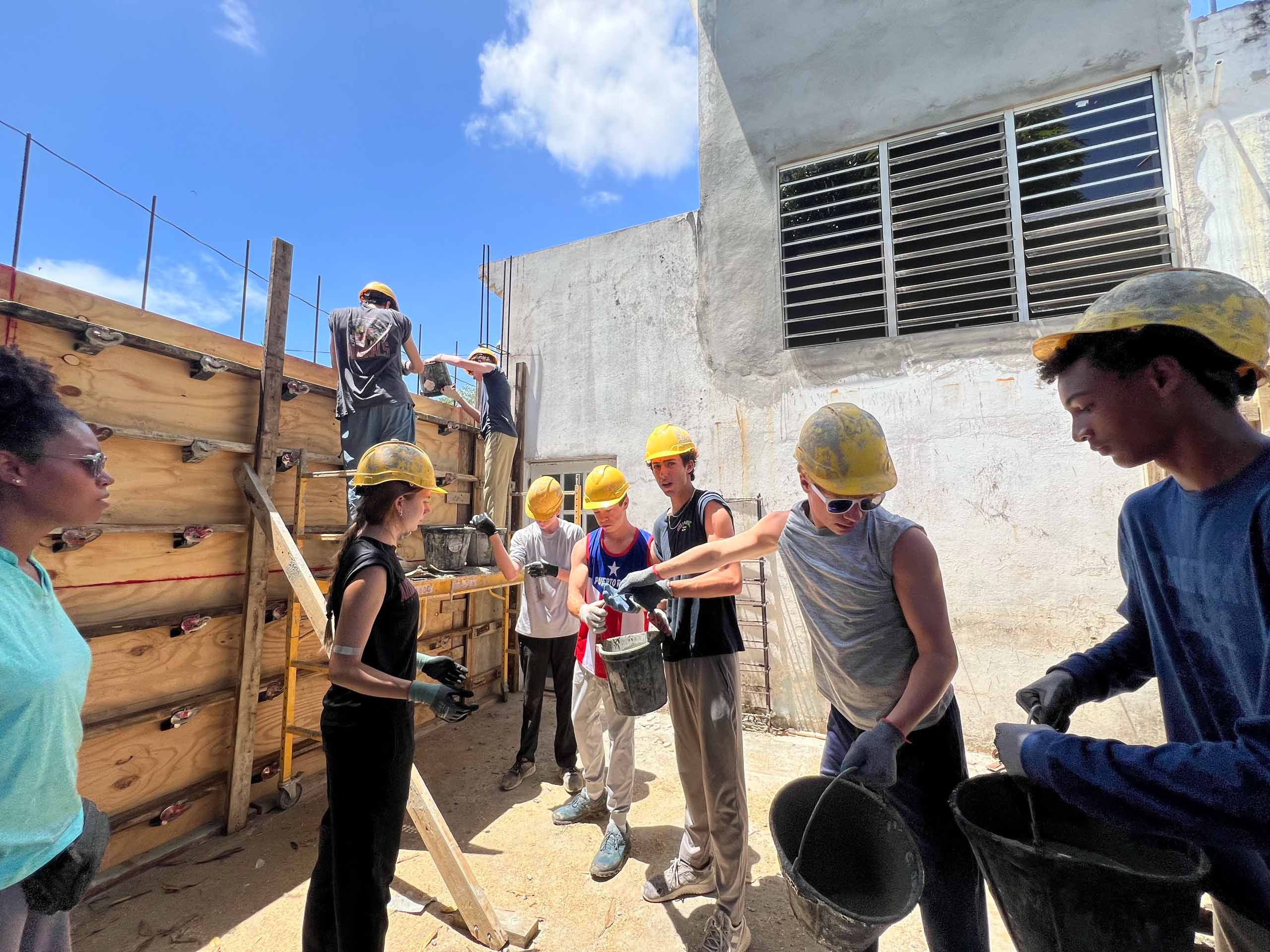 A group of people wearing construction helmets work together, passing buckets near a wooden structure under a sunny sky.