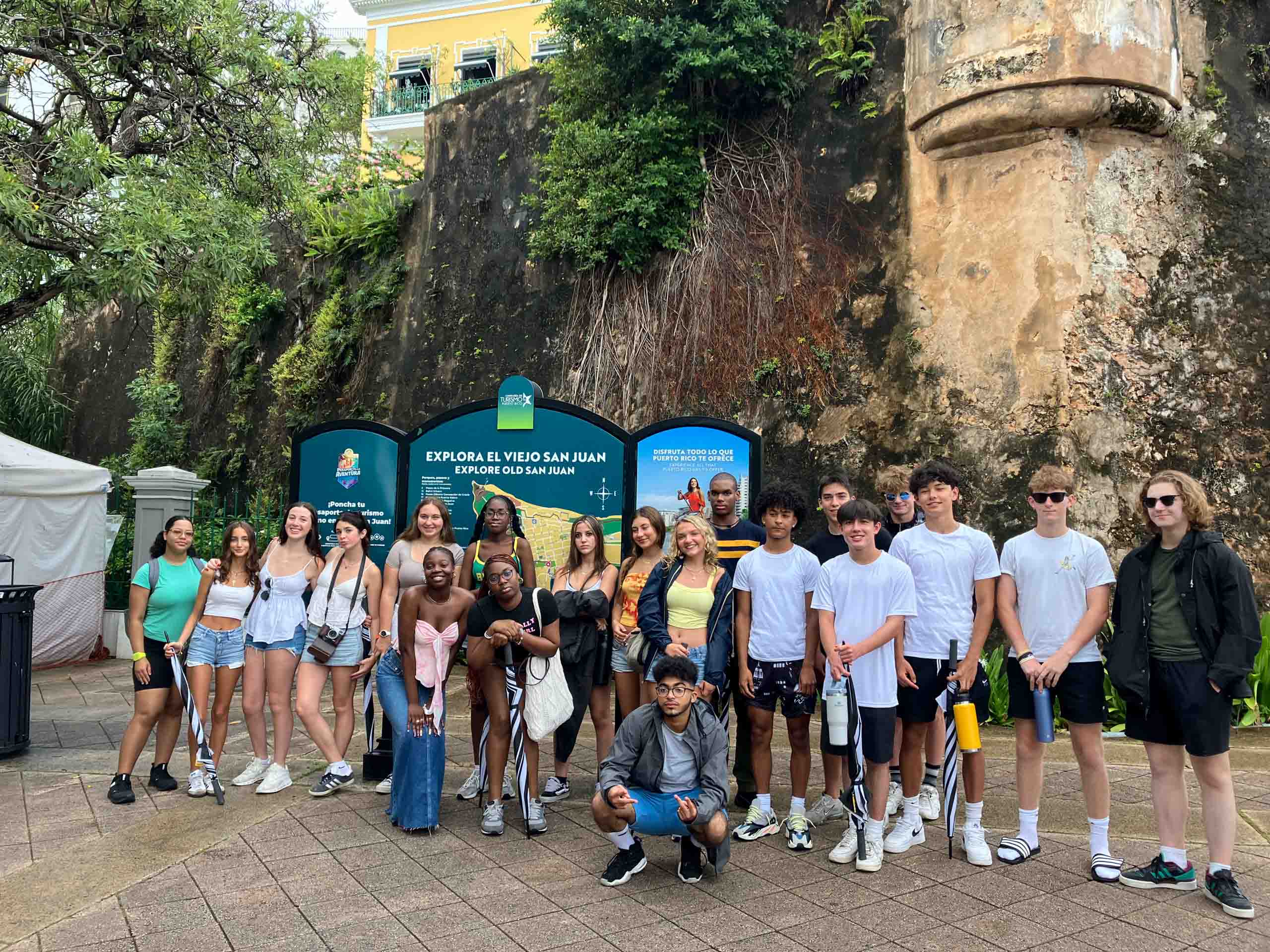 A group of young people stand in front of a sign and a historical wall, posing for a photo. Some hold water bottles and backpacks.