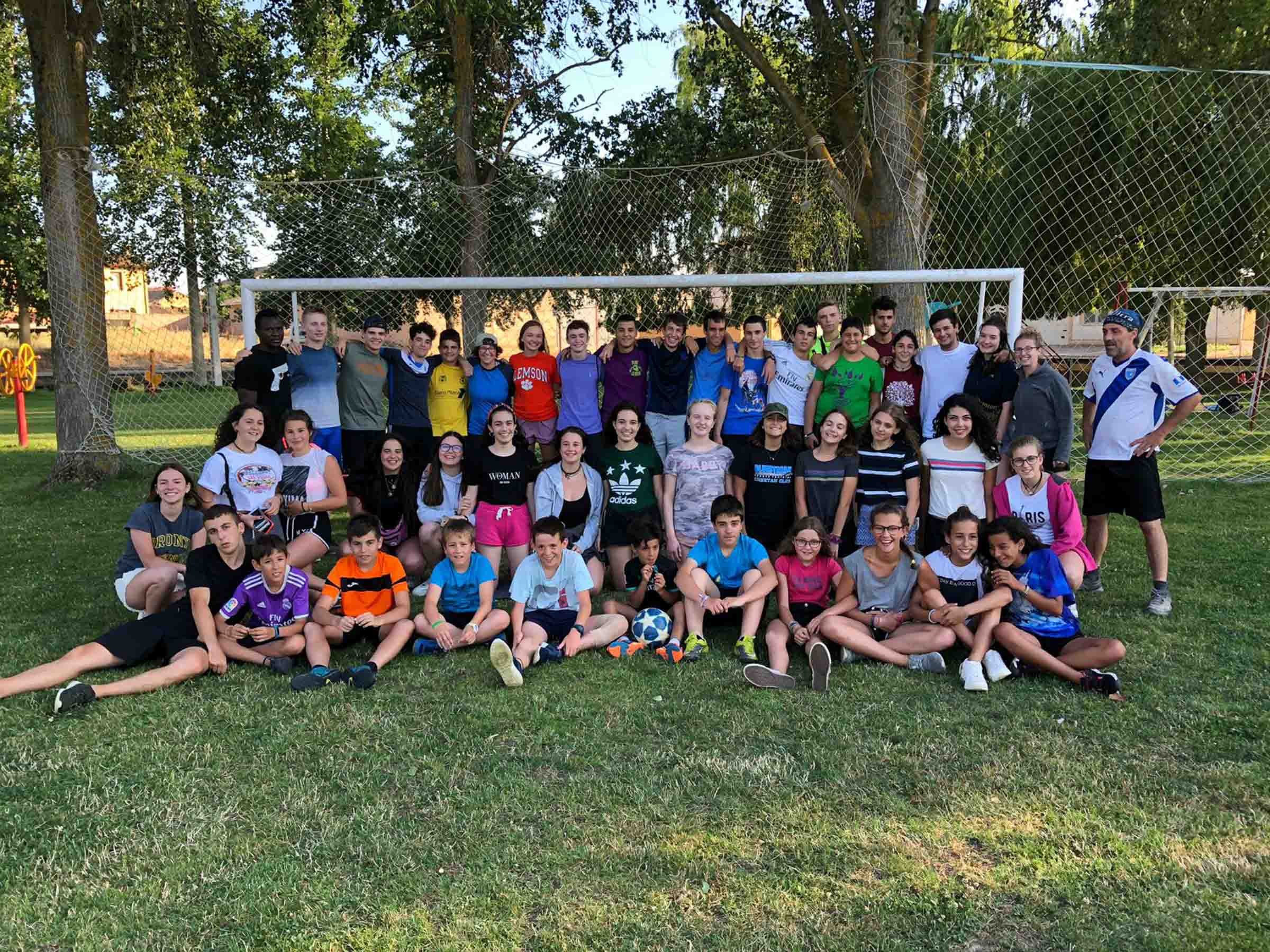 A group of people, including adults and children, pose in front of a soccer goal on a grassy field with trees in the background.