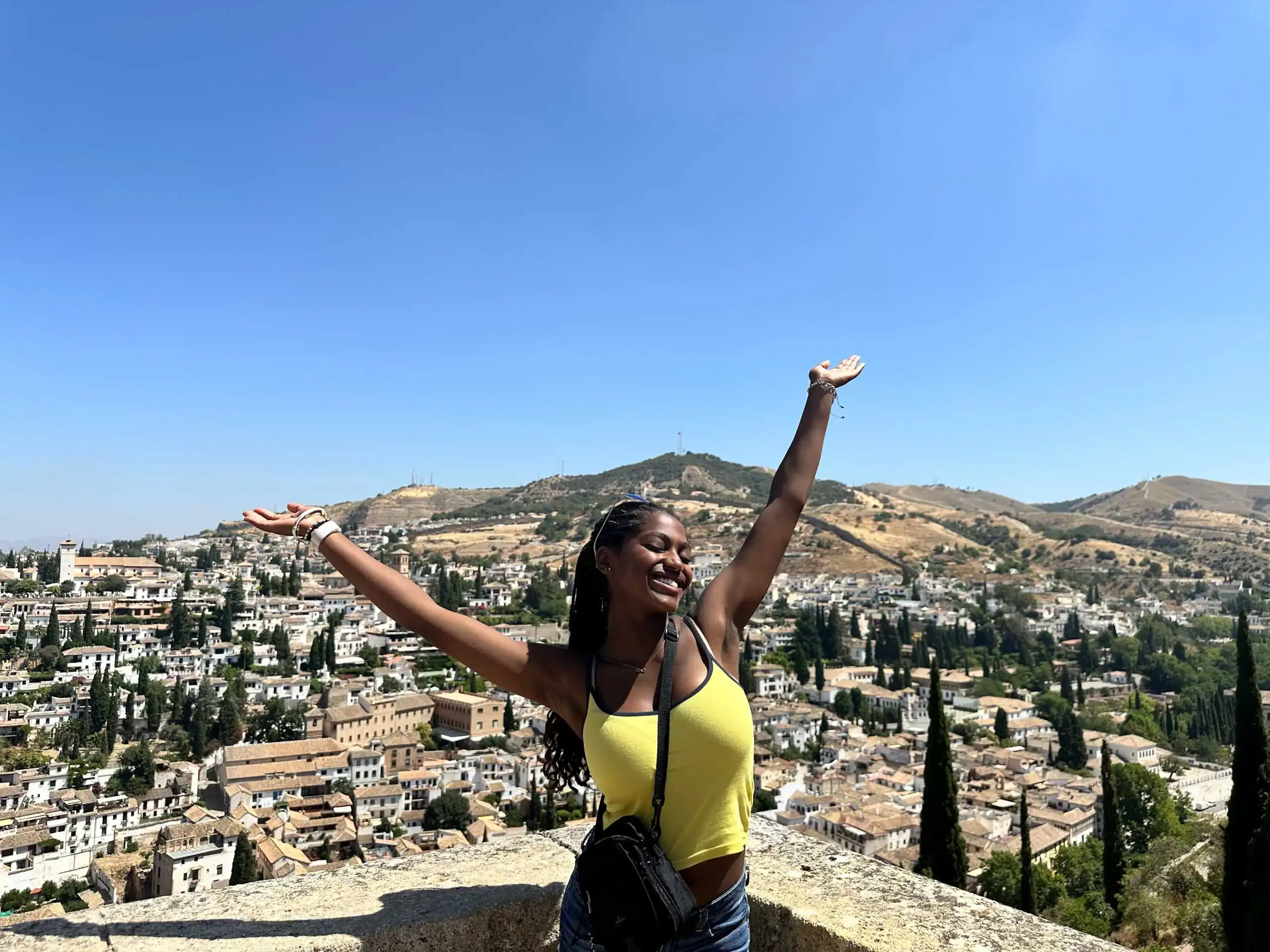 Student in a yellow top stands with arms raised, smiling, enjoying a sunny hillside town and clear blue sky during her Spain school trip.