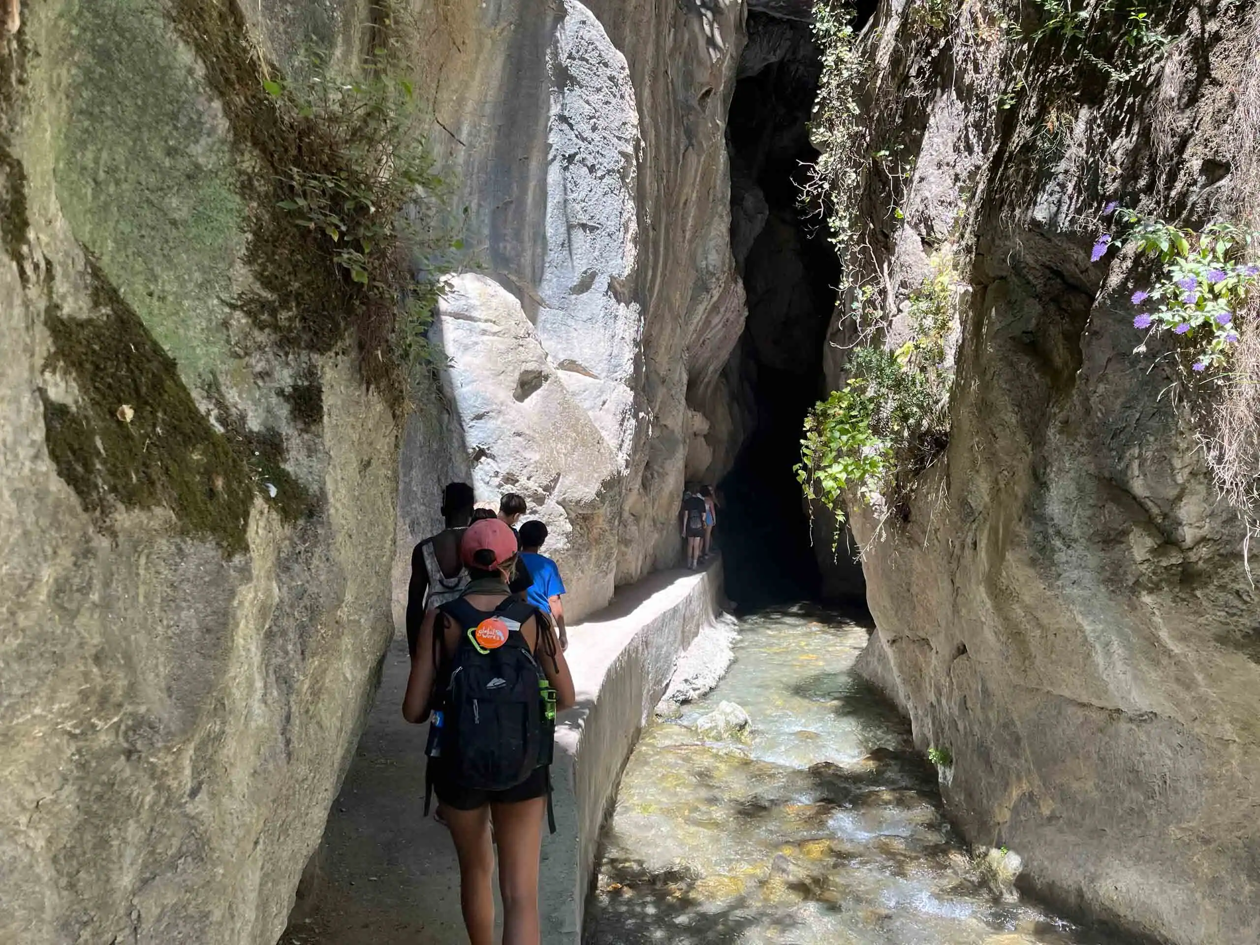 People with backpacks hike along a narrow path beside a stream through a rocky canyon, enjoying sunlight and greenery above—an unforgettable experience on our Spain summer travel program.