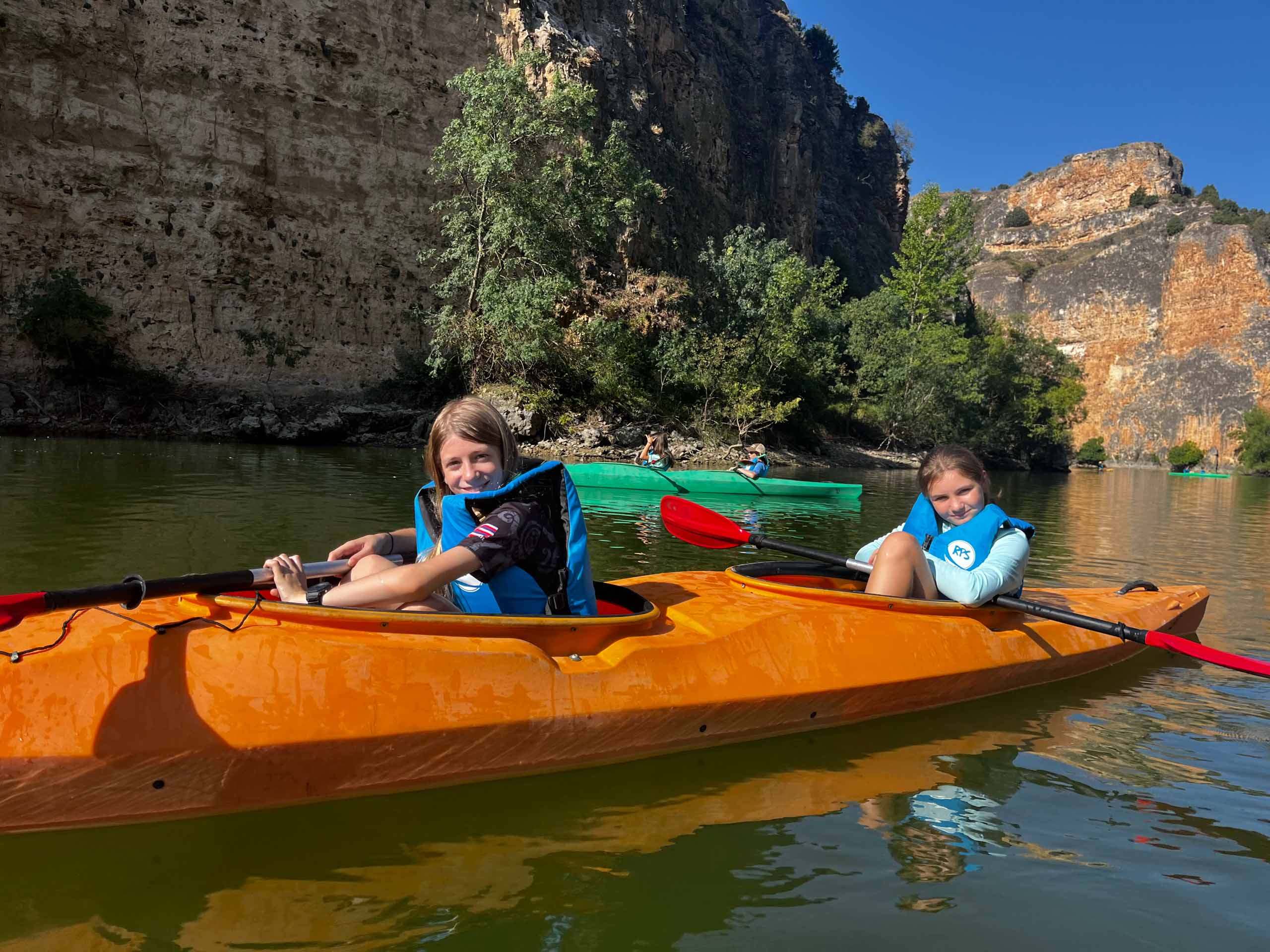 Two kids in life vests paddle an orange kayak on a calm river, surrounded by rocky cliffs and greenery under a clear blue sky.