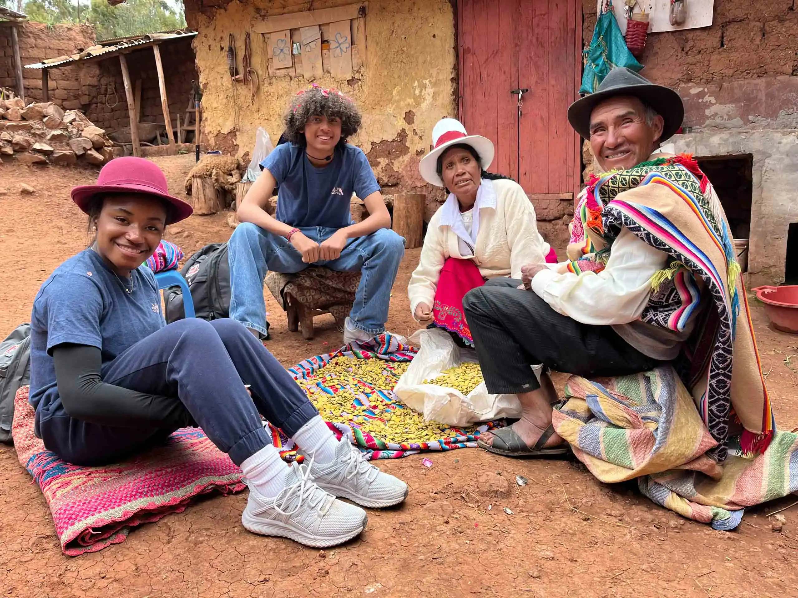 Four people in a rural setting are seated on a blanket, surrounded by colorful textiles and corn. They are wearing casual and traditional clothing, with a rustic building in the background.