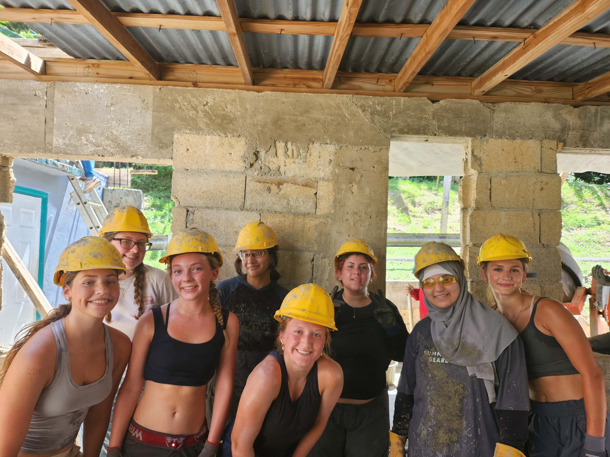 A group of eight people wearing yellow hard hats and casual work clothes stand together in a partially constructed building.