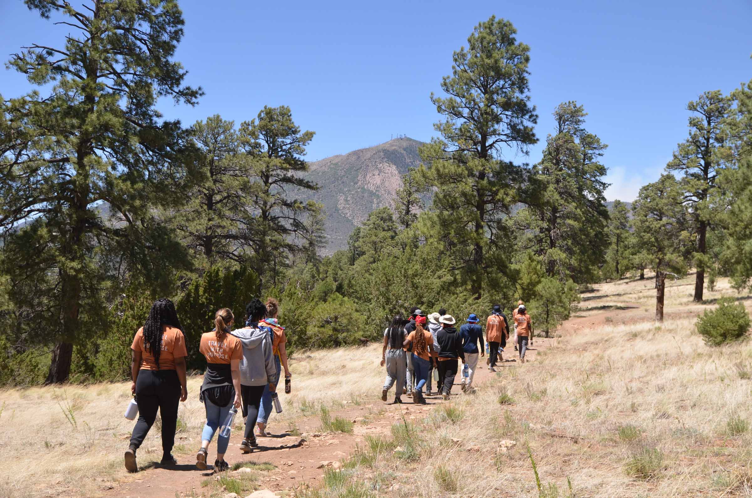 A group of people hiking on a trail through a grassy area with tall trees and a mountain in the background.